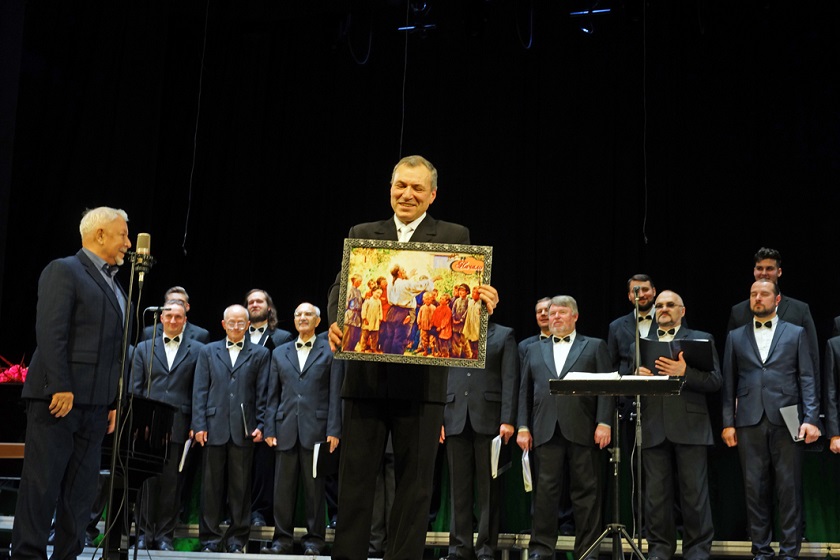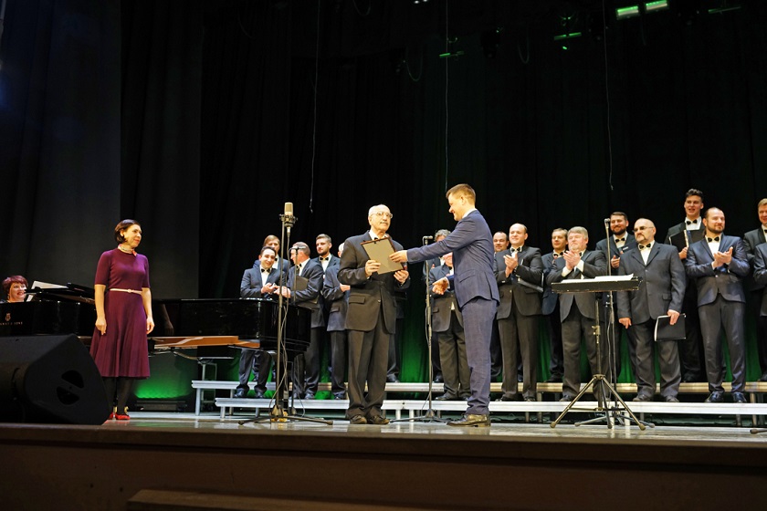 В этот вечер звучало много песен, много искренних слов и поздравлений. К артистам обратился региональный министр культуры Павел Суслов. Он пожелал коллективу творческого долголетия, а также продолжать традиции, заложенные Евгением Деревяшиным. Министр вручил хору почетную грамоту губернатора Калужской области. Также грамотой был награжден старейший артист хора Юрий Яковлевич Дрибинский.