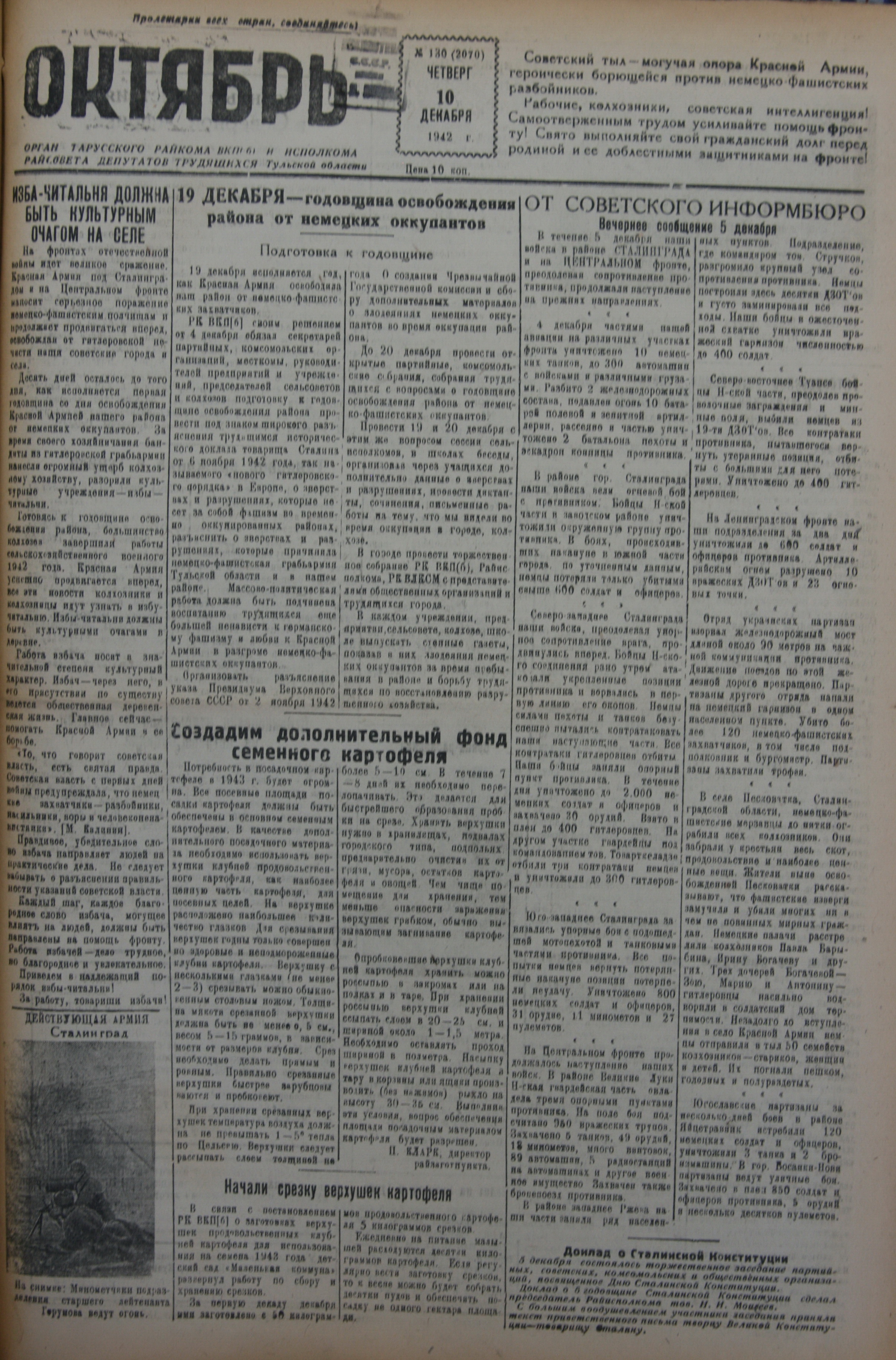 Это письмо было опубликовано в № 130 тарусской районной газеты «Октябрь» за 1942 год. Там же, под ним, помещалась заметка с характерным для тех лет названием «Мы не забудем, мы не простим!». Ее подписали две жительницы села Кузьмищево под Тарусой А. Калянова и К. Лазарева. Уже минуло несколько месяцев, как район был освобожден, но о преступлениях фашистов продолжали помнить и писать.