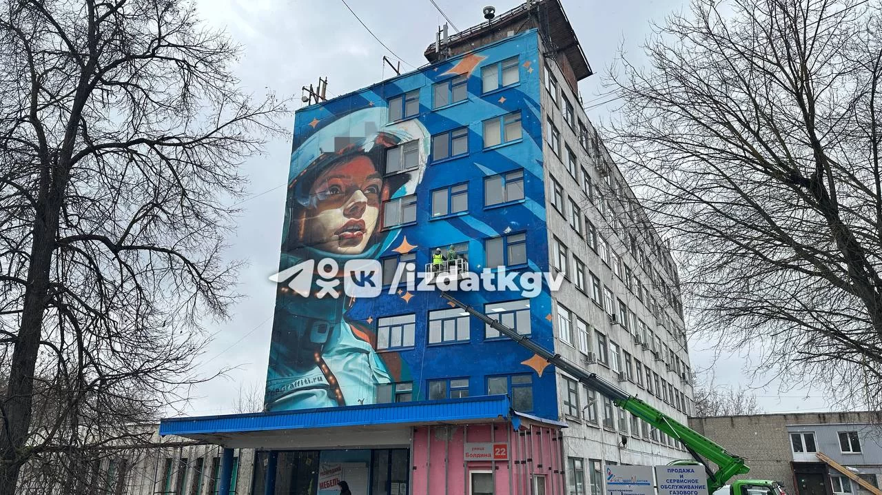 Новый стрит-арт появился на одном из калужских зданий неподалеку от спортшколы «Юность». Масштабное граффити с изображением девушки в скафандре получилось 25 метров в высоту и 16 метров в ширину.
