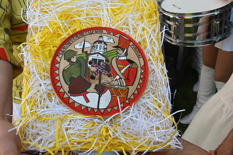 И вот сегодня, 11 июня, на фестивале национальных культур Малоярославецкий район торжественно передал делегации Мещовска сундучок, вложив в него ещё и свою малоярославецкую пуговку. Она вручную раскрашена картинками лучших пейзажей Малоярославца в стиле лубка. История пуговки символична, ведь своим происхождением она связана со словом пугать и с древних времён считалась для человека оберегом. Вот и Малоярославец, как пуговица, всегда закрывал границу к Москве от врага.