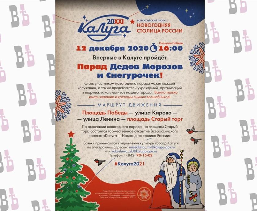 Напомним, Калуга встретит 2021 год в статусе Новогодней столицы. Стать участником новогоднего парада может каждый калужанин, также представители учреждений организации творческих коллективов города. Важно только иметь желание и костюмы зимнего волшебника. Процессия дедов Морозов и Снегурочек пройдёт от площади Победы по улицам Кирова и Ленина до площади Старый торг.