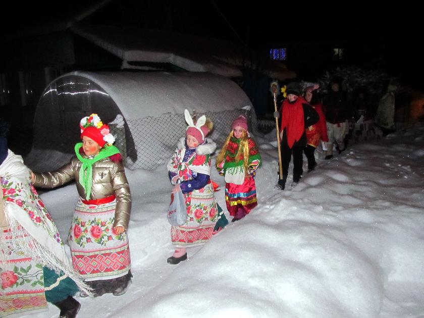 Посмотрев на организованное колядование, мы прошли по улицам села и встретили еще несколько самоорганизовавшихся групп колядовщиков, от совсем маленьких, сопровождаемых (в отдалении) родителями, до подростков. Наряжены они были скромнее, репертуар беднее, но вот задора побольше! Конечно, не все они в равной степени были интересны – кто-то стеснялся колядовать приезжим, многие признавались, что взяли припевки из интернета…