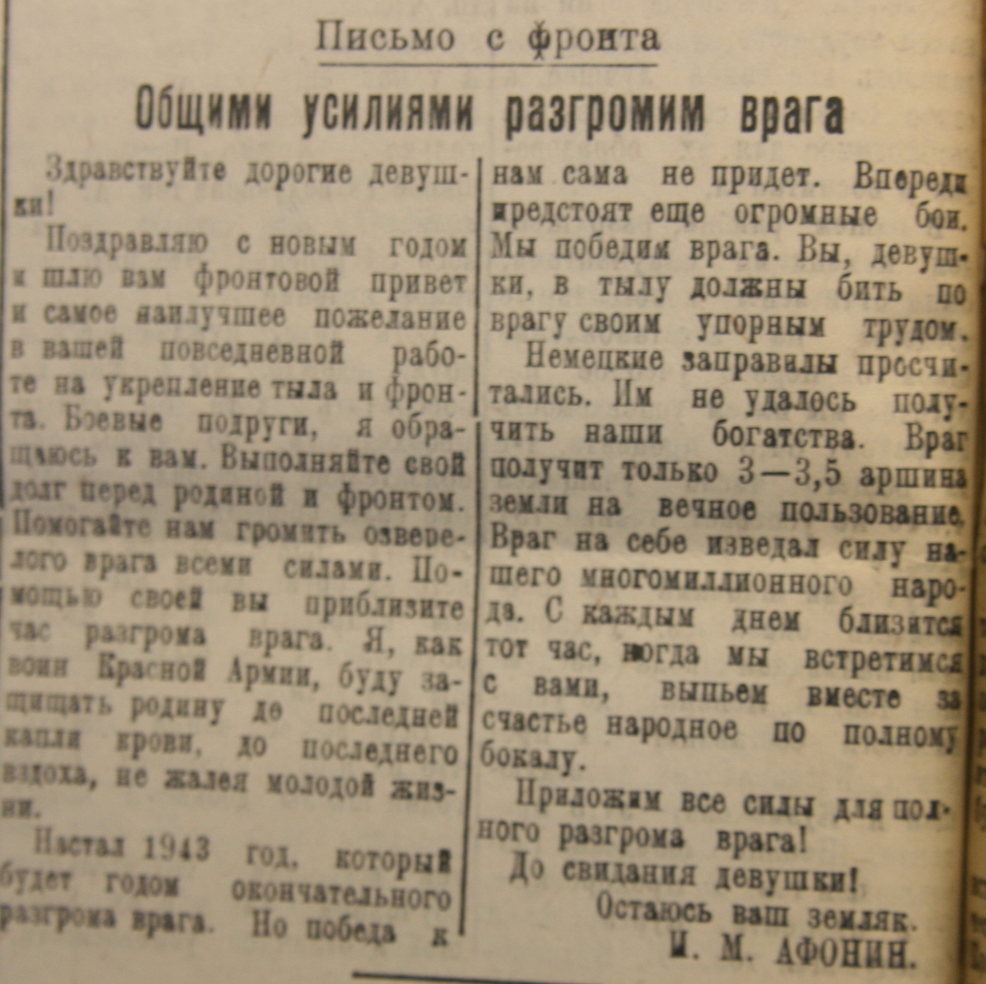«Поздравляю с Новым годом и шлю вам фронтовой привет и самое наилучшее пожелание в вашей повседневной работе на укрепление тыла и фронта. Боевые подруги, я обращаюсь к вам. Выполняйте свой долг перед Родиной и фронтом. Помогайте нам громить озверелого врага всеми силами. Помощью своей вы приблизите час разгрома врага. Я, как воин Красной армии, буду защищать Родину до последней капли крови, до последнего вздоха, не жалея молодой жизни.