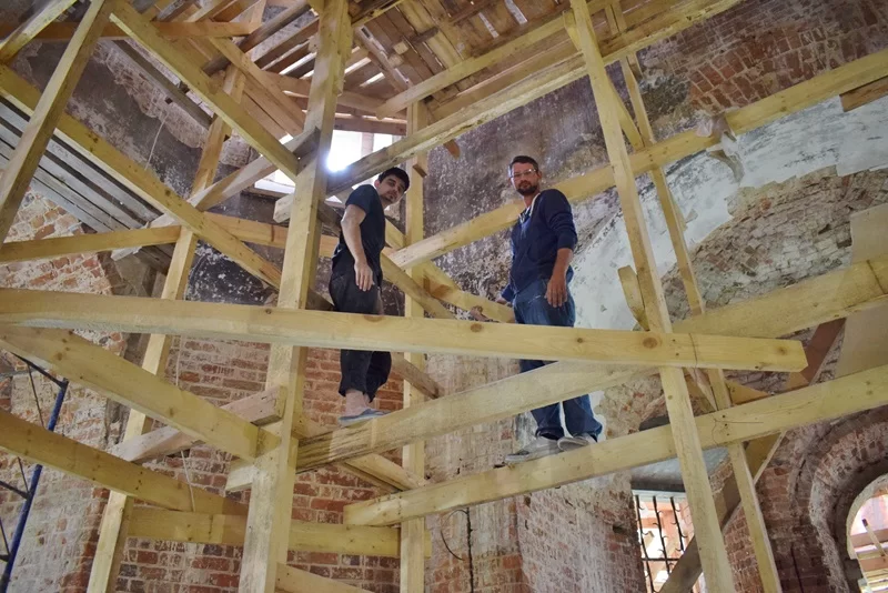 Из-за колебаний температуры и влажности в аварийном храме фрески сильно пострадали. Некоторые фрагменты, отслоившись от стены, висели в воздухе. Реставраторы бережно демонтировали их, чтобы сохранить на деревянном основании. Сейчас частично снят штукатурный слой, фрески находятся в заклеенном виде. Это слои хлопковой реставрационной бумаги, слой марли и слой армирующий, «удерживающий» живопись. Потом заклейки аккуратно снимут. Процесс сложный, длительный и проходит в несколько этапов.