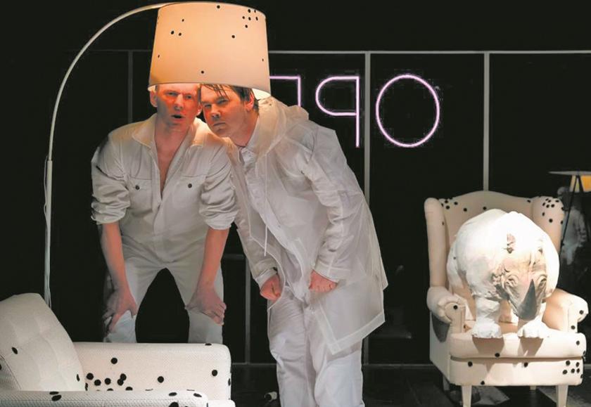 Комедия «Летние осы кусают нас даже в ноябре» поставлена по пьесе Ивана Вырыпаева молодым режиссером Ксенией Самодуровой и представляет собой классический театр абсурда. Уход от реальности мы видим с самого начала, когда нам представляют персонажей и даже называют их по именам. Для пущей верности к каждому еще и бирка с именем привешена, но написанное не всегда является тем, что написано. В метафоричность и нереальность погружают нас и декорации – комната, в которой множество телефонов, заставляет задуматься – не сон ли это, не обман ли зрения, не плод ли больного воображения?Все становится более или менее понятно, когда один из персонажей признается в телефонном разговоре, что они курили «необычные» сигареты. Сценограф-дебютант Алевтина Ляпунова мастерски усиливает эффект ненормальности происходящего белым больничным цветом – одежда на персонажах (не в палате ли номер 6 все происходит?), белые светильники и, наконец, плод галюцинации – большой белый носорог. Причем белый цвет здесь вовсе не означает чистоту и невинность, есть в нем что-то ущербное. Это подтверждают и пятна на белых абажурах и белом кресле, и разговор между персонажами, с виду мирными и невинными. Но, вслушавшись, можно понять - есть червоточинка в этих чистых отношениях. Вовсе они не белые и пушистые.