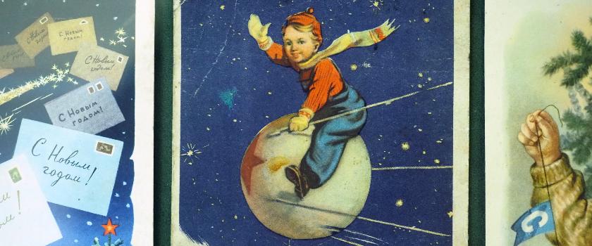 После войны, после тяжелых испытаний и лишений на наполненных новогодним настроением поздравительных открытках изображали радостное мирное время, трудовые и спортивные достижения, детство. Но главными сюжетами были Кремль, Спасская башня и советская символика. А вот космическая эра СССР на открытках ознаменовалась летающими вокруг Земли спутниками, мальчиками в костюмах космонавтов и Дедом Морозом в ракете. Открытки стали настоящим украшением дома. Их берегли, размещали на самых видных местах – комодах, сервантах, на стенах, в рамках рядом с семейными фотографиями. А кто-то мастерил из них вазы и шкатулки самых разных форм и размеров, тем самым давая вторую жизнь старым открыткам.Сегодня издательства выпускают репринт тех открыток и почтовых карточек. Такое ретро пользуется спросом у знатоков, потому что классические изображения уже признаны и узнаваемы, и в витринах они тоже есть.