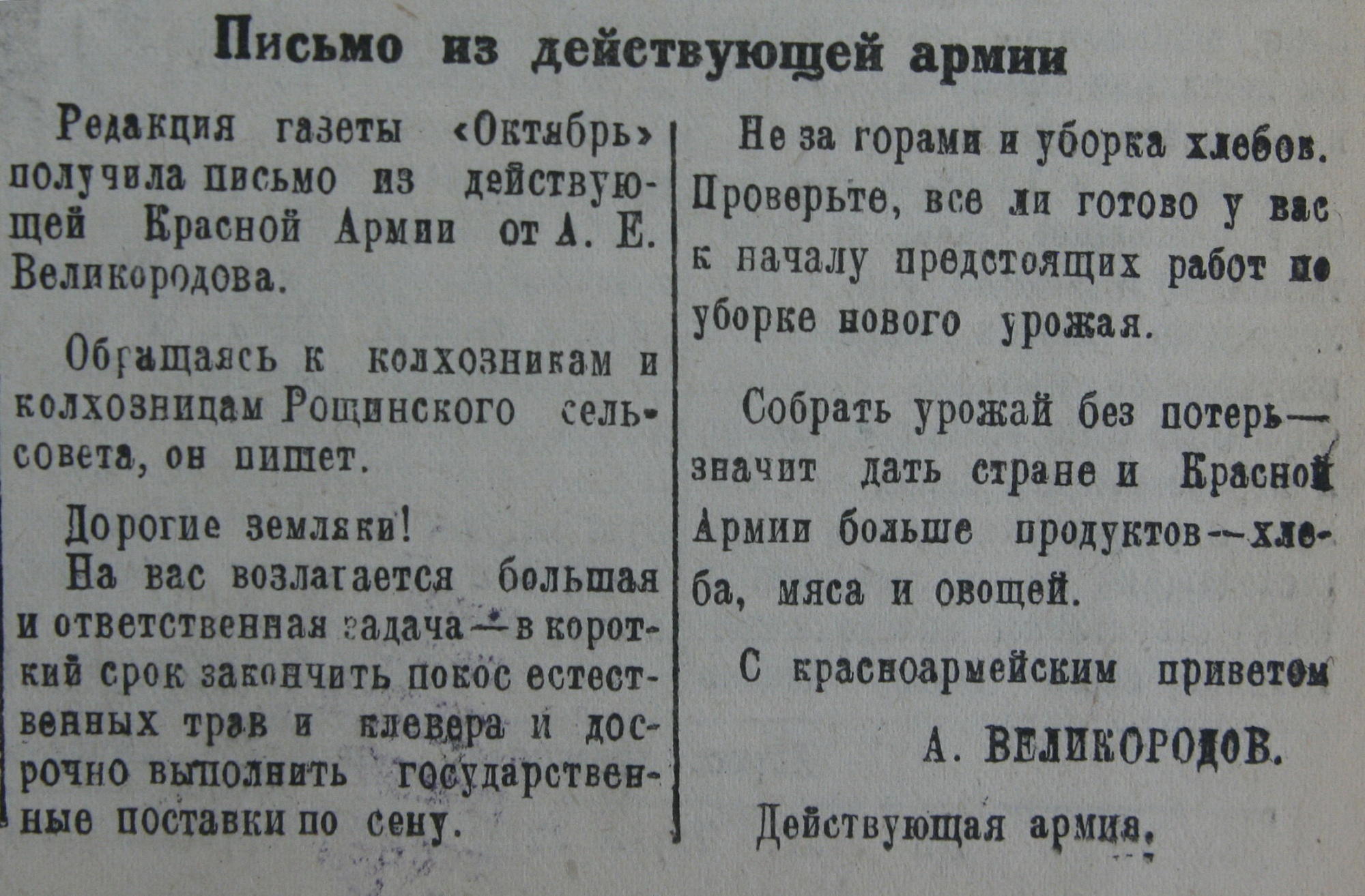 Редакция газеты «Октябрь» напечатала рядом письмо из действующей Красной армии от А.Е. Великородова, не расшифровывая инициалов. В нескольких строках предисловия уточнялось, что автор обращается к колхозникам Рощинского сельсовета: