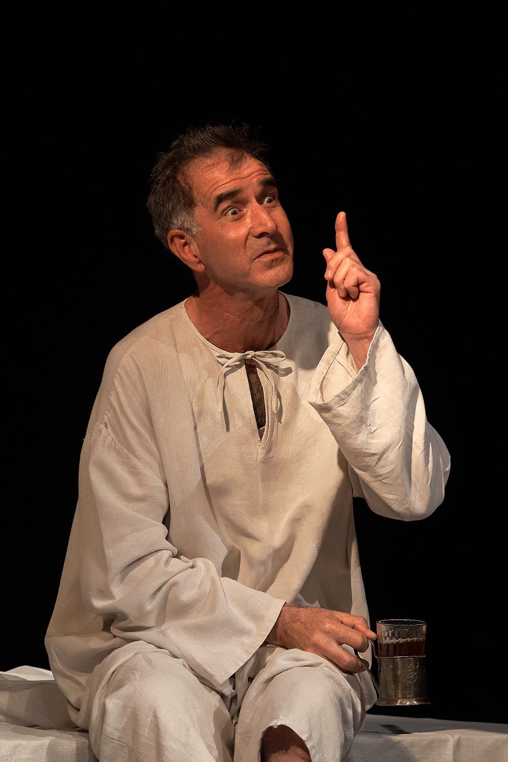 - Имамитдина Акаутдинова можно назвать ярким представителем Вахтанговской школы. В нем синтезируется два направления театральных школ. Это школа переживаний и школа представлений. Ему подвластна тонкая психологическая игра и яркий жанр буффонады. В нем отражается, как внешне, так и внутренне, европейское и национальное. Он тонко чувствует иронию играемых им ролей. Актер, всегда ищущий, большой самокритичности. Редкий дар интеллектуального актера с сочетанием доброй простоты, - охарактеризовал режиссер Скандарбек Тулпаров исполнителя главной роли.И это описание идеально ложится на то, что увидел зритель в «Записках». Харизма Акаутдинова заставляет смотреть на него не отрываясь. А те самые переходы от тонкого психологизма к гротеску и буффонаде задают постановке ритм. Вот он интимно, как будто у себя на кухне, рассказывает зрителям о походе в театр или о прочитанной газете, а спустя какое-то время уже несет исступленный и страстный эротический бред о Софи. А, к примеру, нервное, но не теряющее иронии чтение знаменитой собачьей переписки контрастирует с по-настоящему эпическим финальным монологом-плачем.