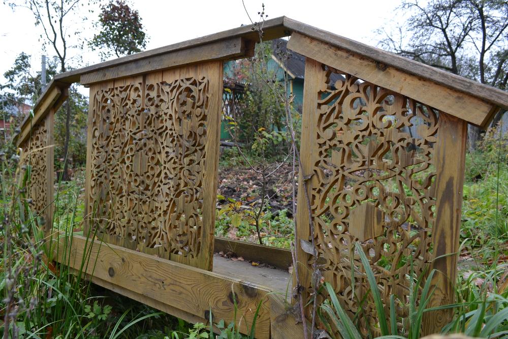 Сказочным растениям и героям тесно в мастерской, и они разбегаются по маленькому участку: озорные ящерки гонятся друг за другом по дверному косяку, через незаметную в траве речку перекинулся резной мостик, и даже вход в конуру здешнего охранника, собаки Чары, украшен деревянными виньетками.