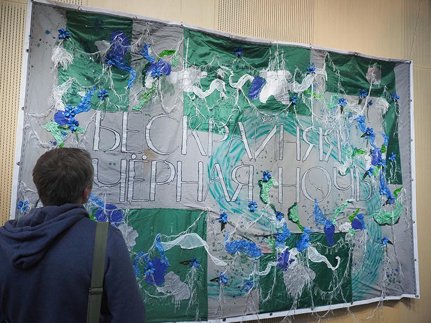 Так называлось одно из полотен, представленных самобытным калужским художником Алексеем Фреем. Выставка «Бескрайняя черная ночь» соткана из фантазий и раздумий автора в период самоизоляции. Каждое полотно можно читать и разгадывать как ребус, а уж разглядывать часами – точно. Изображения, сделанные красками, аппликацией по ткани, вышивкой и прочими невероятными техниками, напоминают что-то из Булгаковского «Мастера и Маргариты» и «Понедельник начинается в субботу» Стругацких. Молодой художник, резидент фестиваля «Циолковский фест», неизменно привлекает публику смелыми концепциями и современным экспозиционным дизайном.Космические крыши