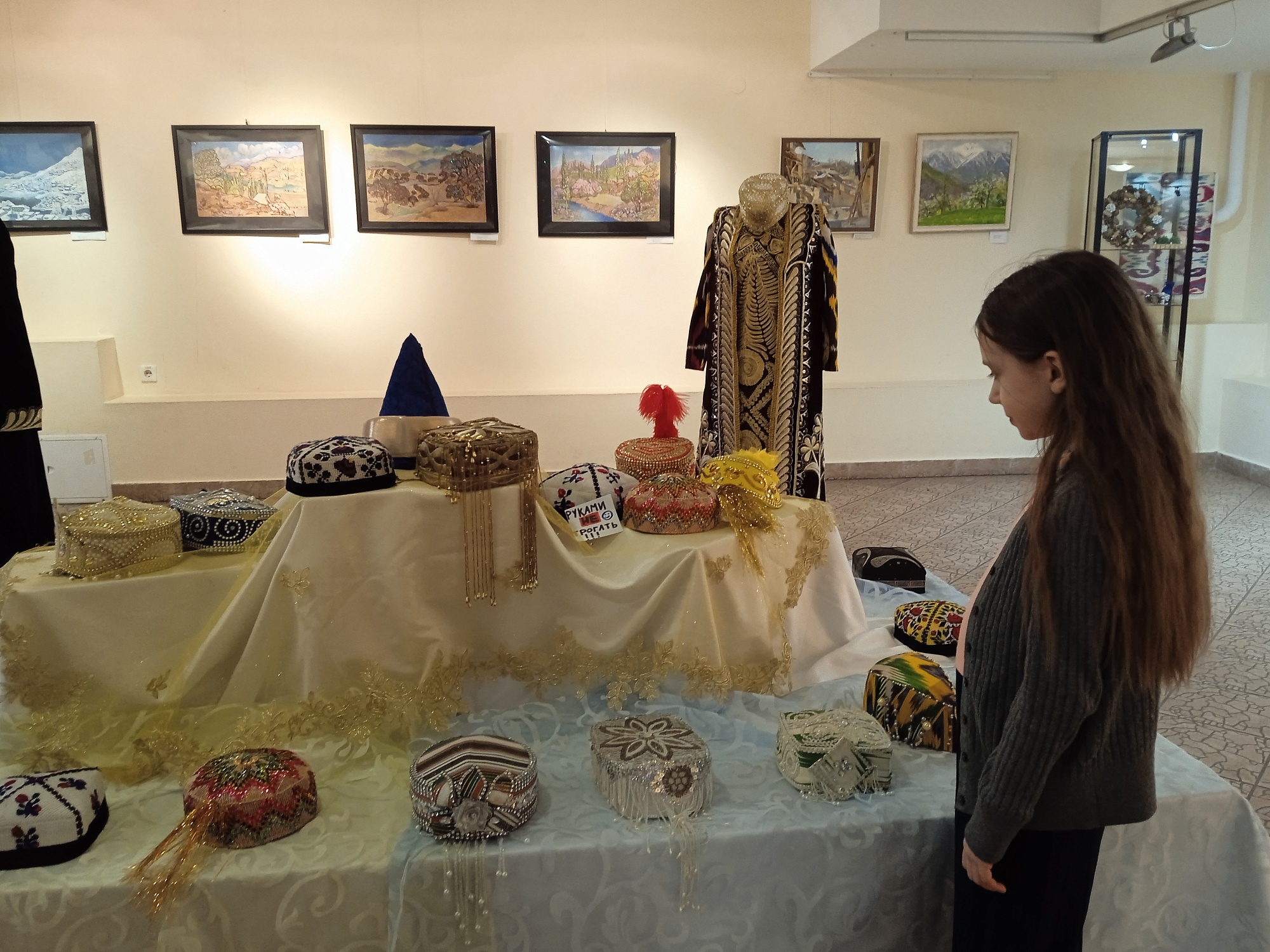 Частью выставки стали национальные костюмы, тюбетейки, а также посуда.