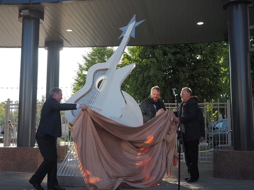 «Замечательно, что мы открываем фестиваль этой скульптурой, символом, закрепляя нашу большую любовь к музыке, гитаре, тем людям, которые дарят нам прекрасную музыку. Композиция представляет собой гитару, опирающуюся на стилизованные пластинки, ее струны тянутся к доминанте скульптуры - звезде. В этом есть отсылка и к космической истории Калуги. Белый цвет гармонирует с новейшим Дворцом спорта напротив и старинными обелисками бывших Московских ворот, один из которых мы симметрично восстановили в конце прошлого года»,