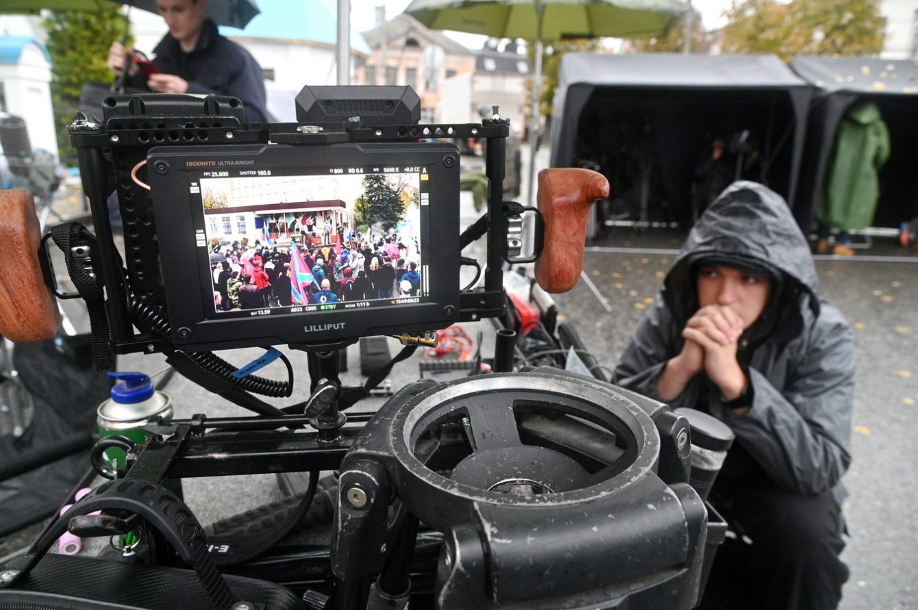 Напомним, Дом печати и улицу Марата еще с утра 15 октября превратили в настоящую съемочную площадку: срезали дорожные знаки, переклеили названия улиц - воссоздали участок территории Украины 2014 года.