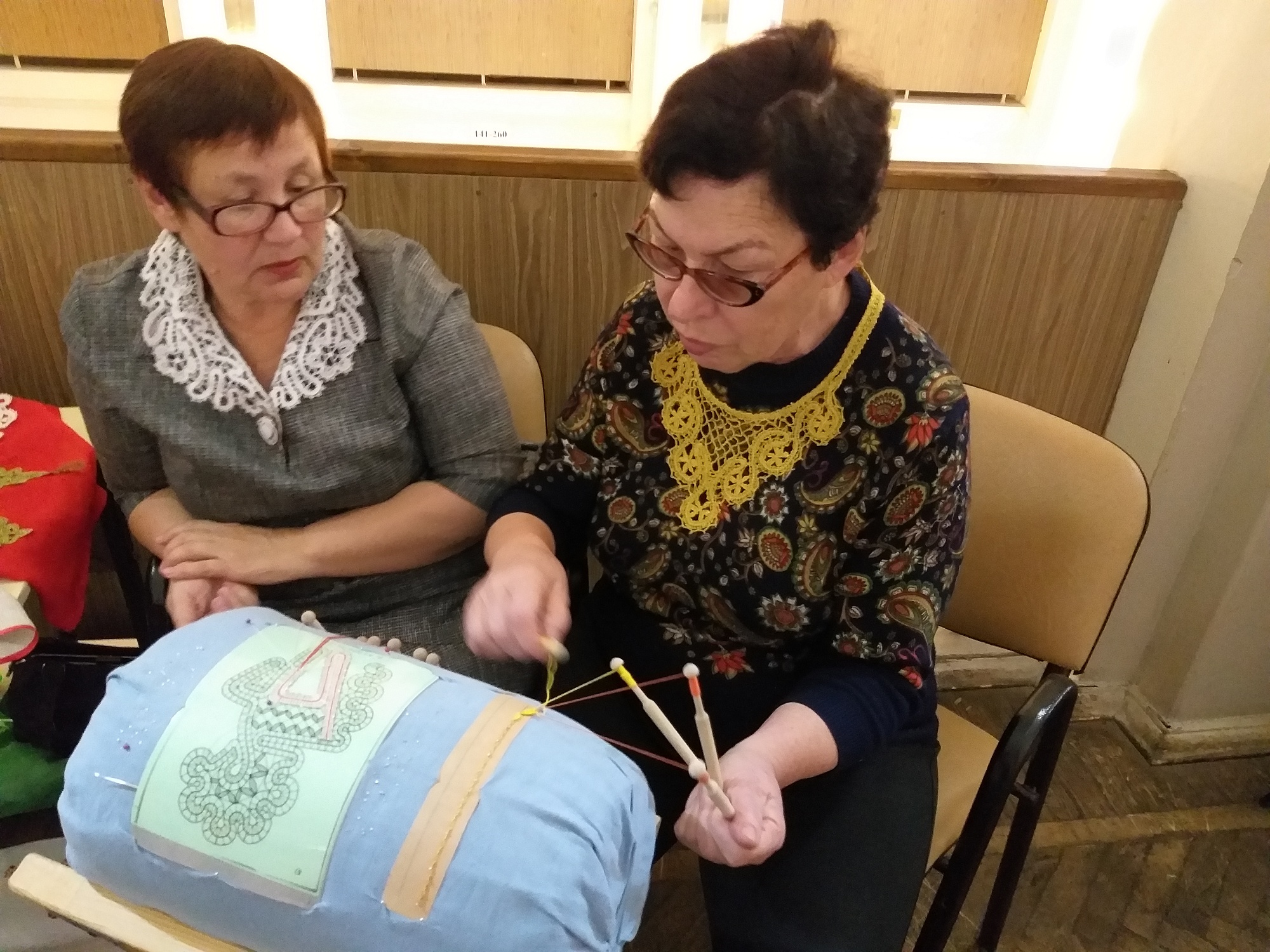 - Это только на первый взгляд сложно. На деле все плетение кружева состоит из двух приемов: перевить и сплести, - объясняет Галина Николаевна. – Коклюшки всегда навешиваются парами. Перевить – справа налево перекладываем коклюшки в паре, сплести – внутреннюю пару слева направо. Для закрепления ставим булавочку. Как видите, никаких узлов нет. Продолжаем наш «плетешок». Помимо него, есть еще три вида элементов: насновка, полотнянка, сетка.