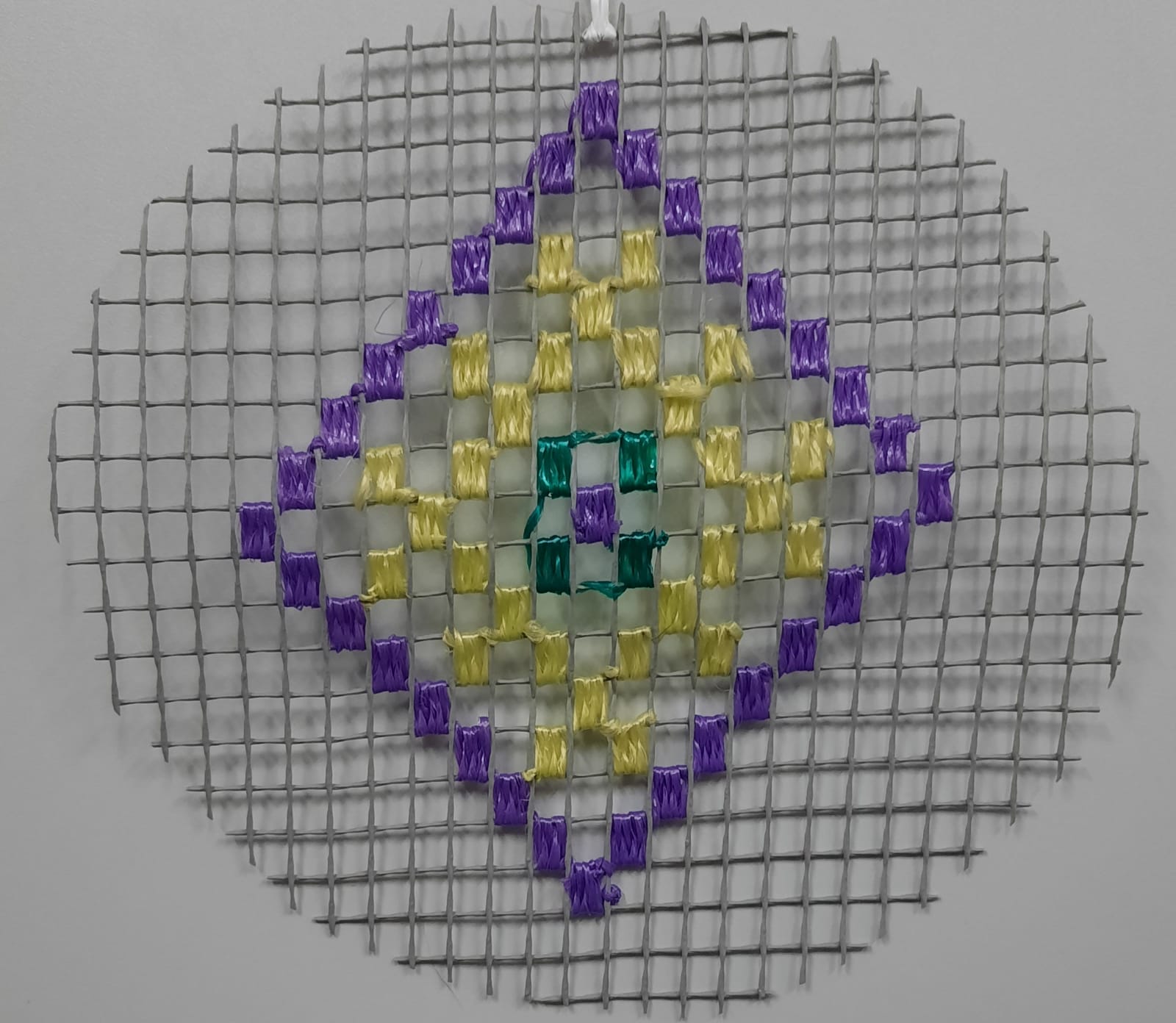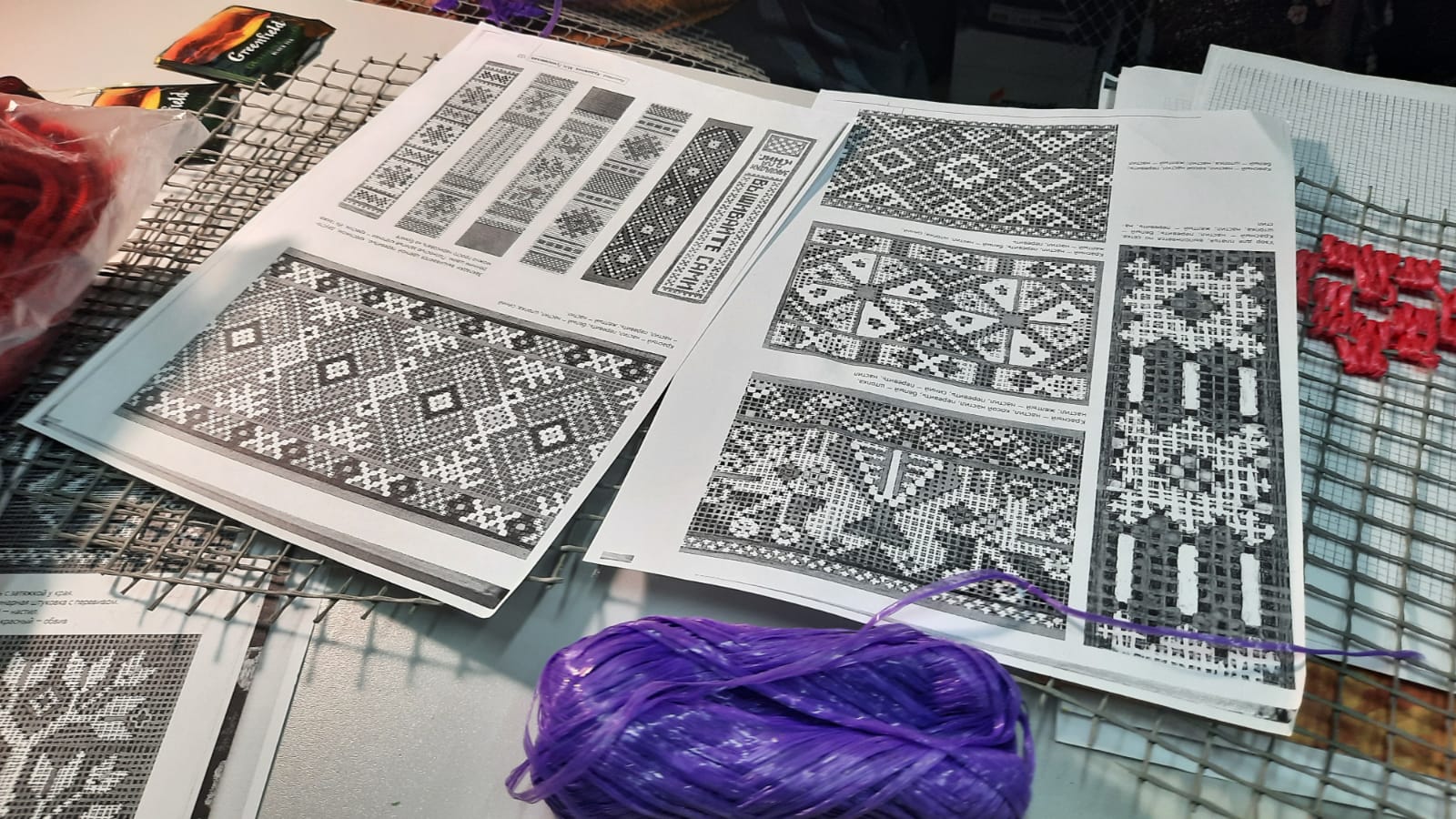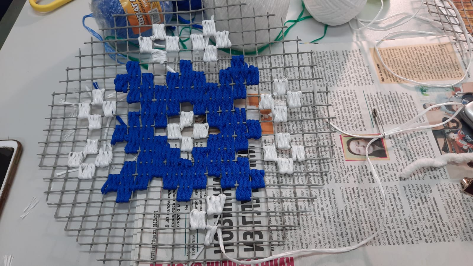 Традиционные орнаменты появляются на сетке с крупными клетками — так же как вышивка «цветная перевить» расцветает на квадратиках полотна. Только масштаб во много раз больше и вместо нитки с иголкой мастерицы используют толстую пряжу и разноцветный шпагат.