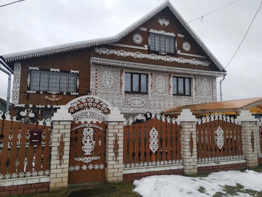 Знакомство с творчеством Юрия начинается у самых ворот его дома. Несмотря на серость нынешних февральских дней, необыкновенный «терем», покрытый со всех сторон резными белоснежными наличниками, напрочь развеивает окружающую тоску и всецело погружает прохожего в сказку. Открываются расписные ворота, навстречу выходит Юрий – приветливый мужчина в рабочей форме, слегка усыпанной древесными опилками. Экскурсия по ухоженной территории двора плавно перетекает в самое сердце - рабочую мастерскую мастера. С первых же минут становится понятно, что его хобби занимает не только время, но и отдельное место в его душе.