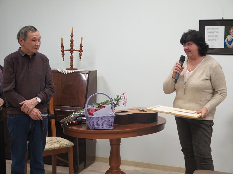 В благодарность барду из Кремёнок дарили не только аплодисменты, но и презенты от друзей-песенников, соратников по перу литературного клуба, директора музея Булаты Окуджавы в селе Высокиничи Оксаны Томаш, заведующей Обнинской библиотеки № 8 «Старый город» Елены Цивцивадзе.