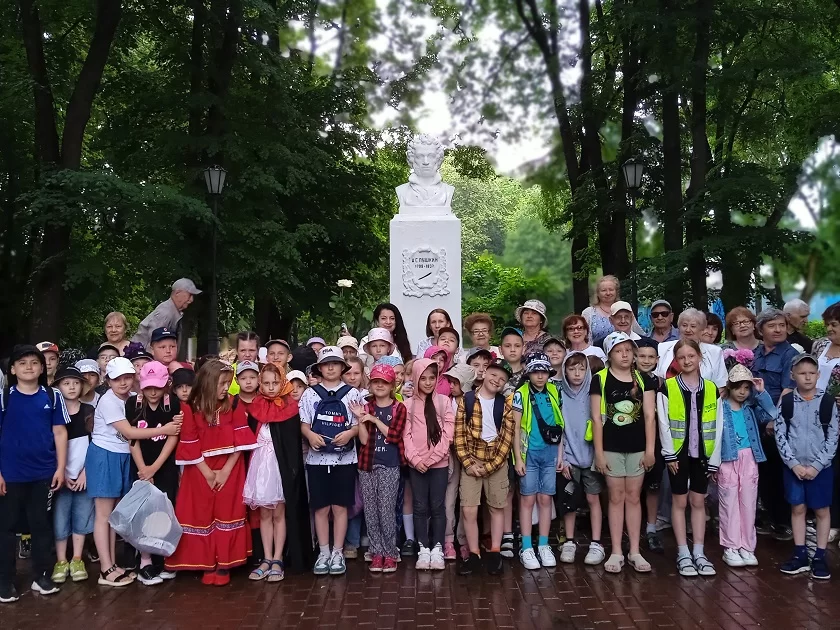 Здесь звучали стихи Пушкина и строки, посвященные ему. Несмотря на начавшийся дождь, дети тоже представили стихи и несколько сценок из сказок классика.