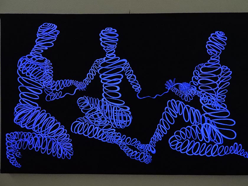 Это дебютная персональная выставка молодой калужской художницы Ирины Царевой. Однако Ирина уже в этом году принимала участие в одном из групповых проектов художника Андрея Бартеньева «Смотрящий за землянами» (Москва). Вообще, ее творчество – живой эксперимент. Дерзкий и непокорный. Наверное, поэтому, экспозиция объединила так много работ, наполненных философским смыслом. Там есть общающиеся, но скрывающие свои лица под личинами масок фигуры… Есть нервы-провода, из которых состоят люди, есть фигуры с обнаженными черепными коробками и грудными клетками. И это все о нас, современных. Это мы все, которые воспринимаем виртуальный мир как нечто реальное и при кажущемся многообразии лиц рядом,-вокруг нас, остаемся одинокими.