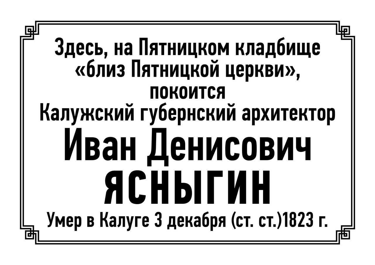 Калужские краеведы получили разрешение на установку памятной доски в честь Ивана Ясныгина. Ее хотят разместить на Пятницком кладбище, где находилась могила архитектора.