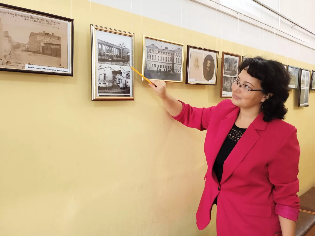В экспозиции – копии исторических фотографий, рассказывающих о разных периодах жизни усадьбы. Здесь можно увидеть интерьеры дома начала XX века, конный экипаж, поданный к подъезду, даму с собачкой, гуляющую около колоннады, музейную экспозицию – с 1922 года в усадьбе Золотаревых действует музей.