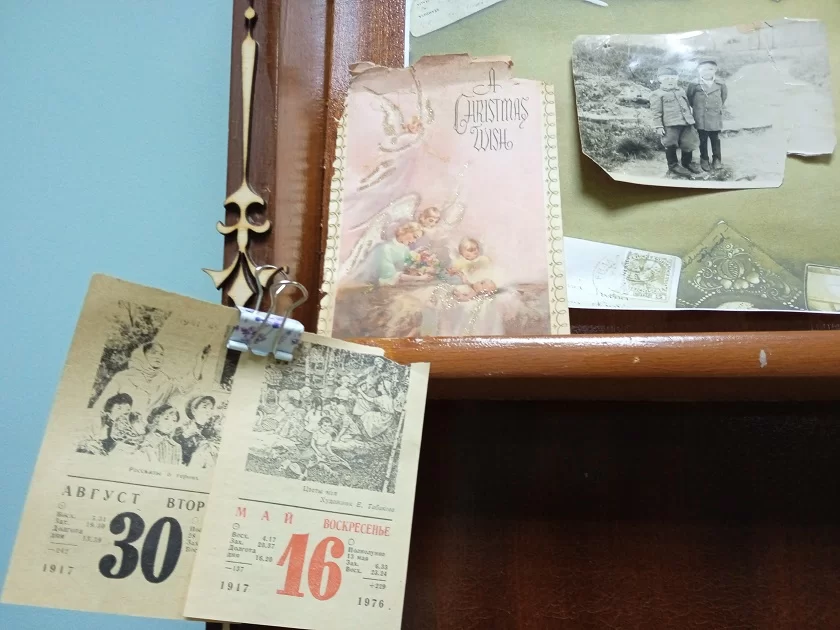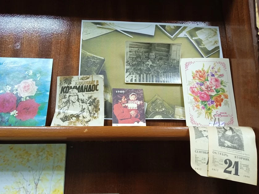 Кроме того, на выставке можно увидеть фотографии 1950 годов, советские открытки, вырезки из газет, листки перекидных календарей, один из которых отправляет посетителей библиотеки в 1976 год. А еще – личные записи долгов с определенными суммами около каждого имени, выписанные из книг пословицы и рецепты блюд.