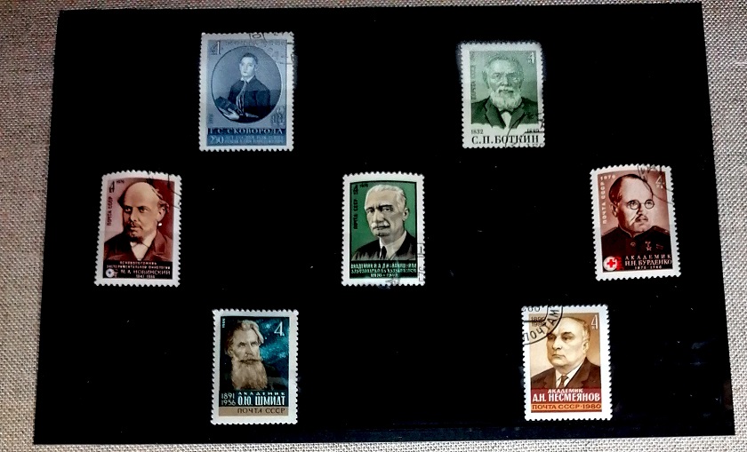 Экспозиция приурочена ко Дню науки в России. Поэтому там можно увидеть марки с различными известными учёными и академиками.