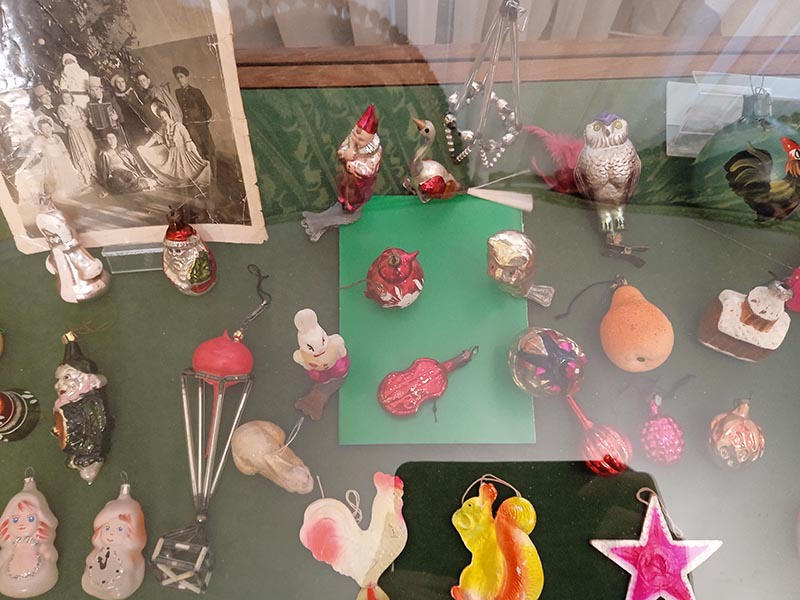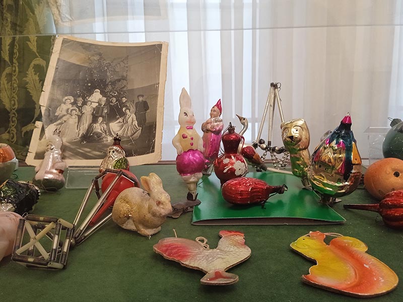 Выставка небольшая, она занимает только лишь витрину, но здесь можно увидеть игрушки 40 – 80-х годов XX века. Эти раритеты бережно хранятся в семье сотрудника музея Елены Левашовой, которая с радостью представила их на обозрение публики. Все они выполнены из разного материала и в разных техниках. Пожалуй, самыми необычными экспонатами являются немецкие игрушки. Как жена военного, вместе с мужем мать Елены Левашовой несколько лет жила в Германии и из этой страны привезла их на память. Каждая игрушка – это частичка волшебства. Особый интерес в коллекции вызывают скрипка, чайничек и стеклянный гусь.