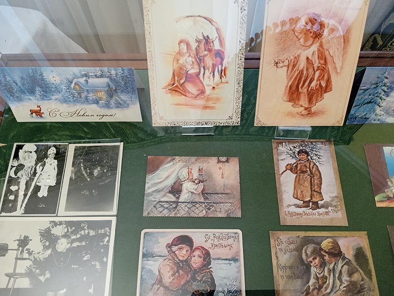 В отдельной витрине представлены репринтные издания старинных открыток. Они выпускались к Новому году, Рождеству и Крещению и уже сами по себе являлись произведениями искусства. Над иллюстрациями работали самые известные художники своего времени. Одной из них стала первая женщина-иллюстратор Елизавета Бем. В экспозиции – репринты поздравительных открыток, выходивши в России в конце XIX – начале XX веков, они были популярны в качестве подарков для родных и друзей. Стоит отметить, что авторы рисовали романтичные сцены из жизни, образы крестьянских детей, героев русских сказок.