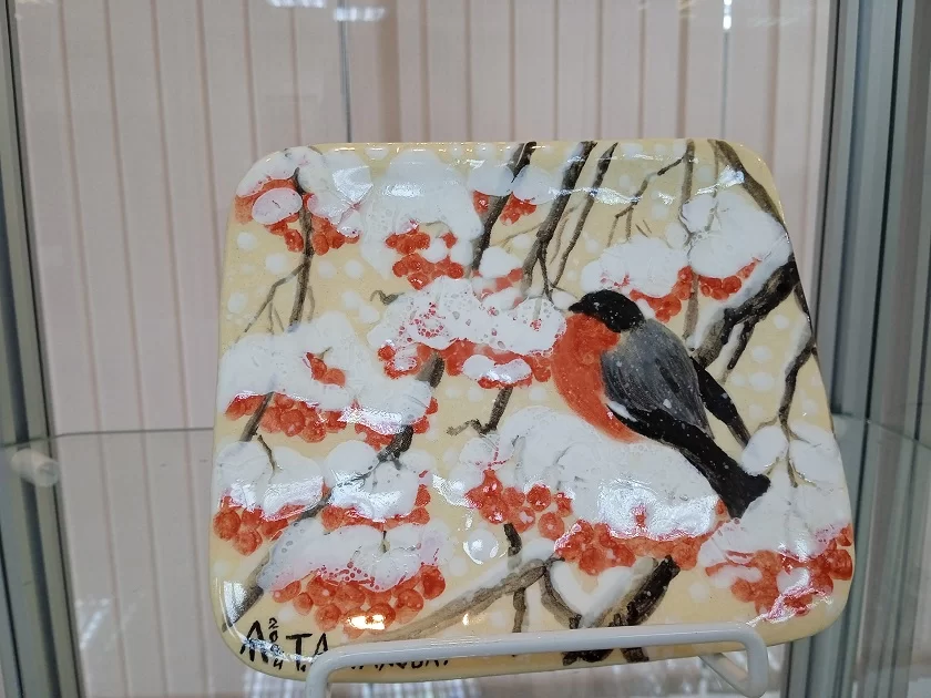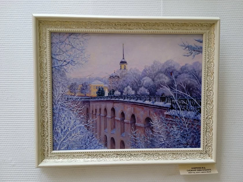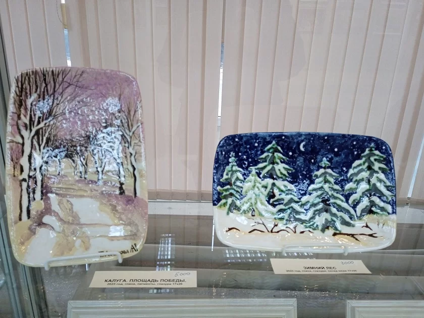 Экспозицию составили работы калужан и мастеров из Обнинска и Малоярославца. Среди имен – заслуженные художники России Татьяна Духанова и Владимир Арепьев, а также Валентин Денискин, Виктор Зундалев, Лия Паладина. Декоративно-прикладное искусство представлено горячей эмалью художественной династии – Людмилы Зайчиковой, Михаила Манулина и Алисы Степановой, керамикой молодой, но уже известной художницы Татьяны Астаховой. Зимние калужские пейзажи в графике выполнены Александрой Чураковой, в этих черно-белых работах удивительно передана атмосфера зимы.