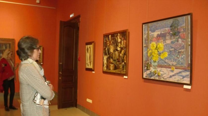 Экспозиция открывается реалистическими тематическими работами. К примеру, в картине Алексея Тихонова «Натюрморт с яблоками» скрупулезно выписана фактура. Художника интересуют яблоки как предмет, их сущность, их материальная составляющая. Большую часть творчества нашего земляка Александра Коняшина занимают натюрморты тематического плана, которые посвящены старинному русскому быту. «Натюрморт с куклой» - один из них. Также укладу жизни наших предков свои работы посвящает Владимир Стожаров. Безусловно, интересна работа «Автопортрет» другого нашего мастера Алексея Базанова, который выразил свое отношение к миру через идейный натюрморт – в изображенных предметах проявил себя, показал, что он художник. В импрессионистской манере писал талантливый калужский творец Иосиф Павлишак – его натюрморт-настроение украсили желтые осенние цветы.
