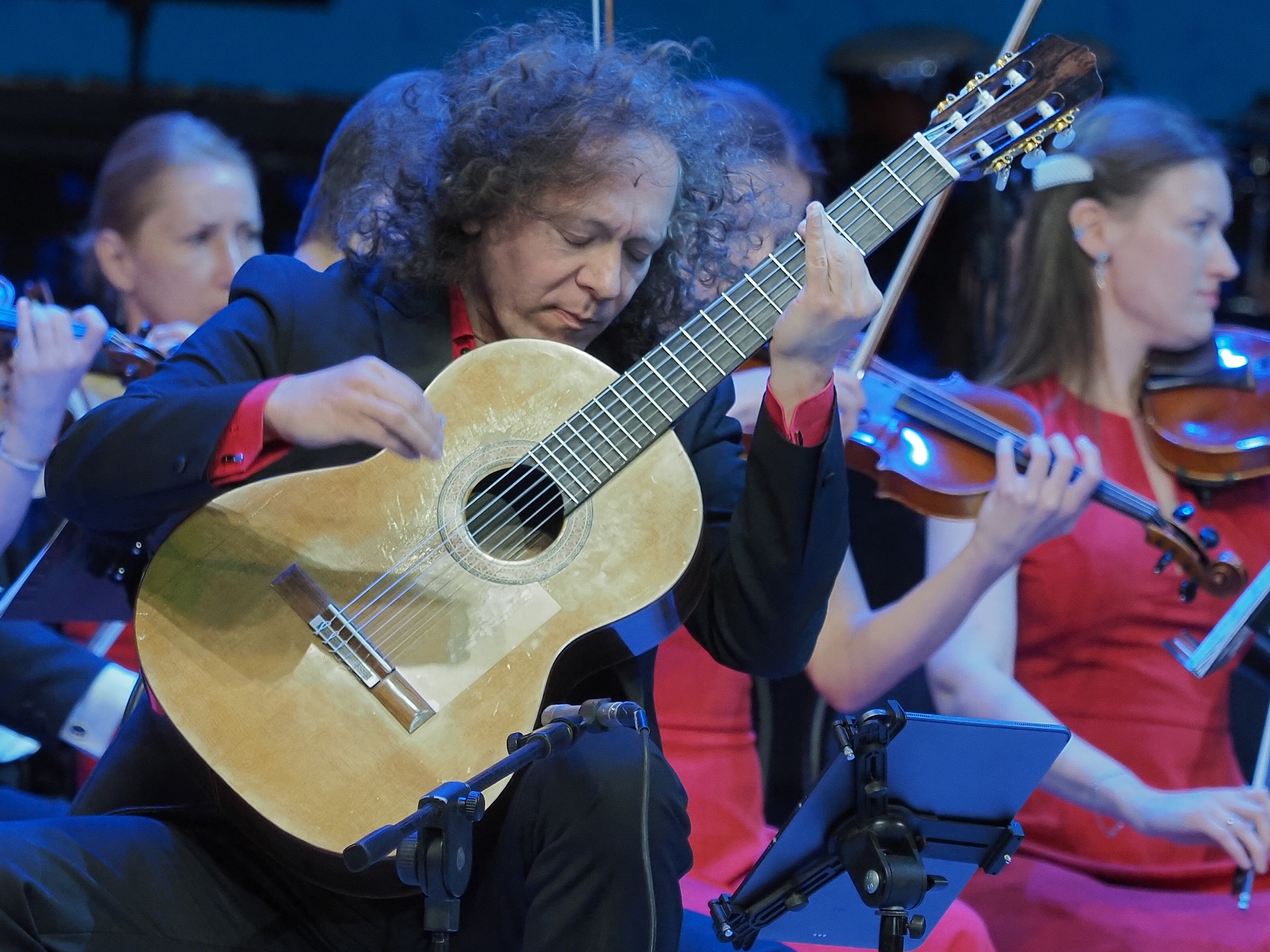 Сегодняшний вечер дал старт и другой премьере: свое искусство игры на гитаре подарил калужским слушателям долгожданный гость фестиваля, испанский гитарист Рафаэль Рикени. Его выступление - диалог с оркестром, а сам Рафаэль - легенда стиля фламенко, автор всех прозвучавших на калужской сцене музыкальных шедевров.