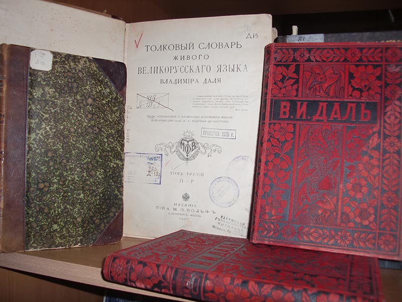 В библиотеке на полках – энциклопедическое царство, советские и современные издания трудов Даля. Одними из редких книг здесь стали несколько томов посмертного полного собрания сочинений 1897 года. Кроме того, читатели найдут критико-биографический очерк и, конечно, «Толковый словарь живого великорусского языка» 1907 года и сборник пословиц и поговорок, вышедший тремя годами ранее, в 1904.