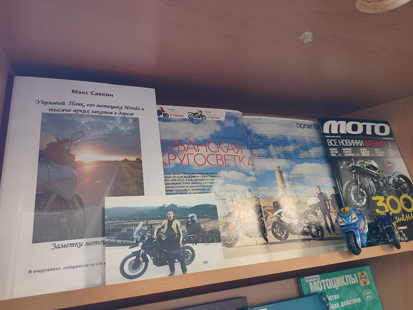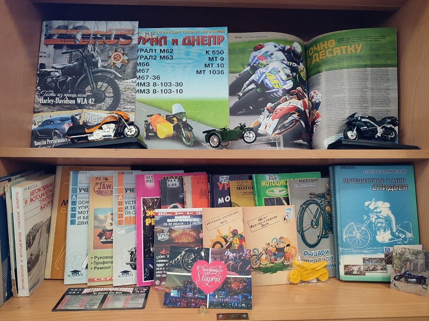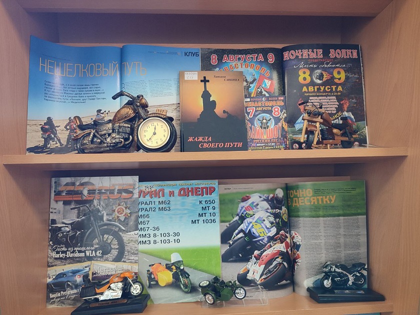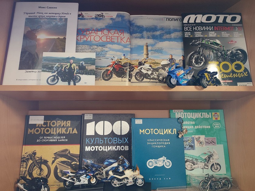 «Мотоцикл – увлечение на всю жизнь. В нашей библиотеке интересующийся читатель найдет много книг, посвященных культовым мотоциклам, их истории и, конечно, путешествиям. На выставке представлено несколько статей о мотопутешествиях в журналах «МОТО», которые мы рекомендуем. Статья «Кубанская кругосветка» рассказывает о поездке по Таманскому полуострову, а статья «Нешелковый путь» – об экспедиции по Средней Азии, где участники преодолели сложные километры. Написаны они очень образно и интересно. Ряд изданий представляет знаменитый российский мотоклуб «Ночные Волки». У кого сохранились воспоминания о «Явах», «Ижах» и «Днепрах», пополнят знания по конкретным маркам мотоциклов – такую выставку мы открываем впервые», - рассказывает Ольга Коваленко, сотрудник информационно-библиографического центра.