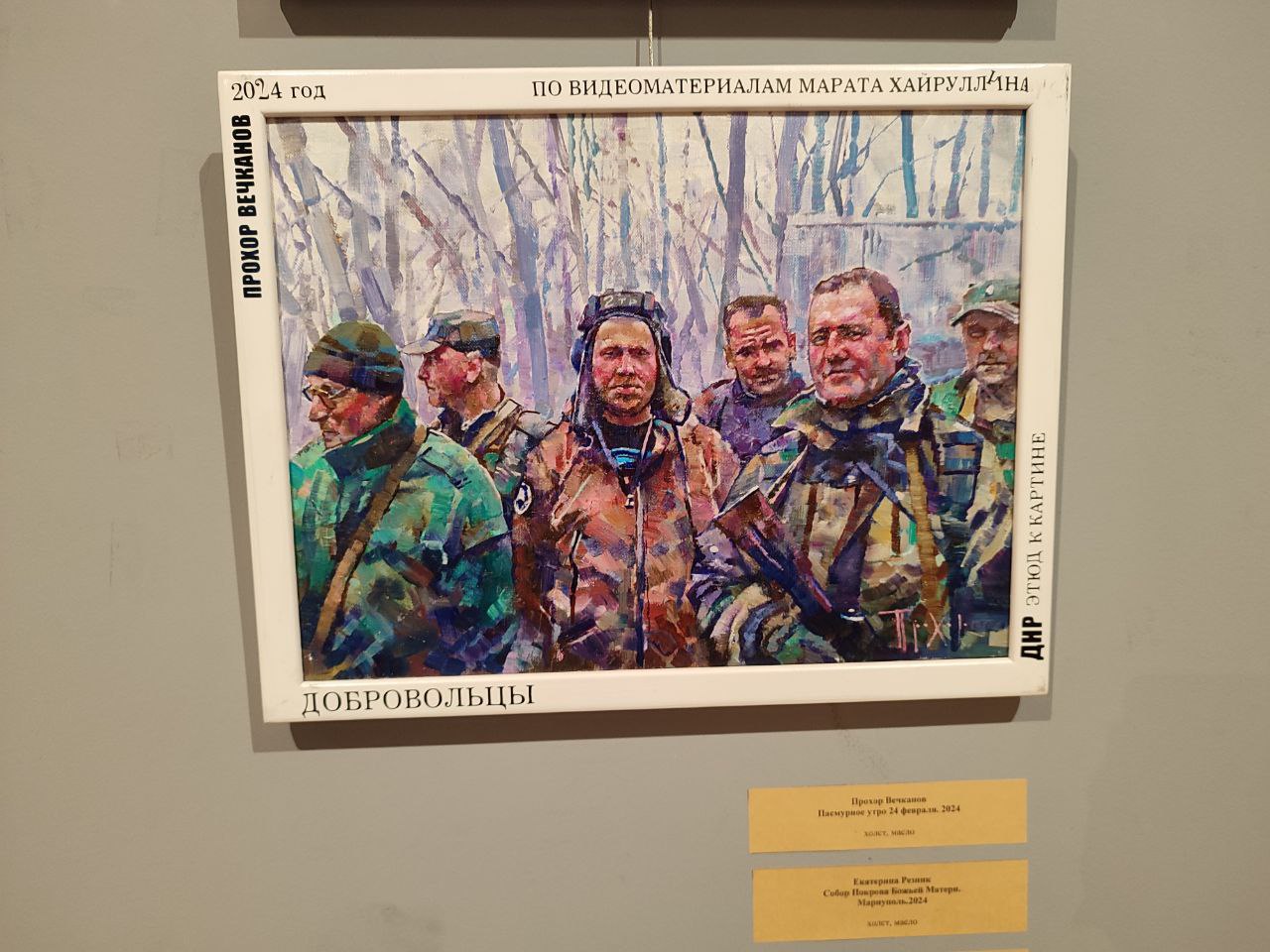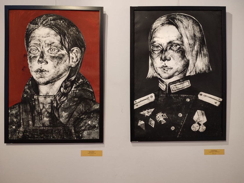 «» «Скульптура получилась душевная, несмотря на то что в ней присутствуют атрибутика и символы государства – герб, на фоне которого стоит солдат в полном обмундировании, с автоматом в руках. Он олицетворяет защитника нашего государства», - отмечает Екатерина Соловьева.Интересен диптих «Маша и Мария». На одной работе изображена девочка – маленький ангел – это интерпретация образа тех самых донецких ангелов – детей, погибших от рук украинских нацистов во время обстрелов. На втором полотне – Дева Мария – Богородица, которая принимает этого ангела к себе (автор Дарья Яблонь-Соловьева).