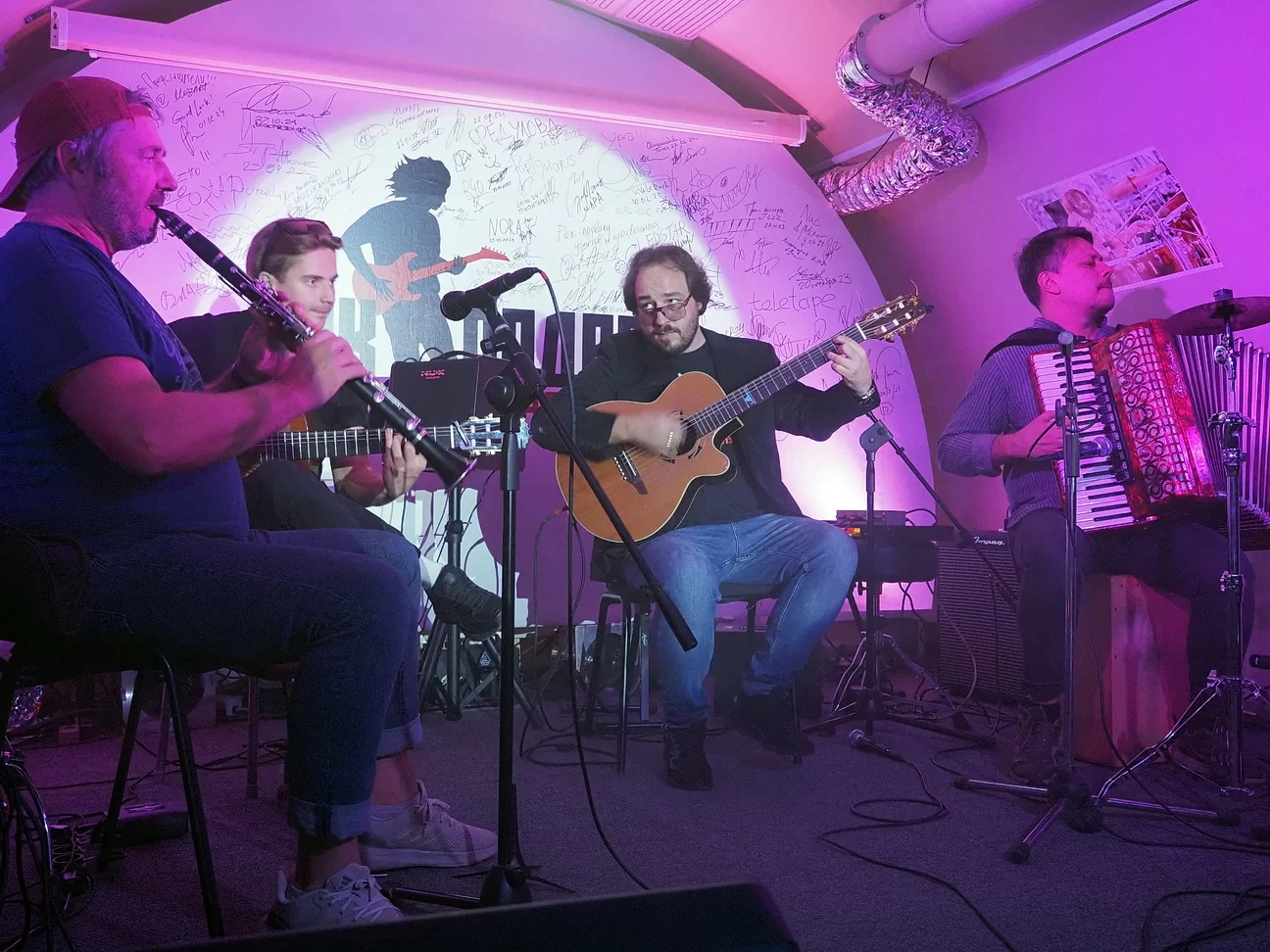 Здесь выступил квартет Ивана Смирнова. Из его названия от фамилии вполне можно убрать добавление «младшего», поскольку коллектив является совершенно самостоятельной оригинальной творческой командой, продолжающей традиции своего основателя выдающегося отечественного гитариста Ивана Николаевича Смирнова, которого часто называли талисманом музыкального фестиваля «Мир гитары», отца двух братьев - Ивана (акустическая гитара) и Михаила (клавишные, аккордеон, перкуссия) Смирновых, входящих сейчас в состав квартета. Кроме них в коллективе играют также Иван Юнаш (акустическая гитара) и выдающийся исполнитель на этнических духовых Сергей Клевенский. Репертуар квартета составляют как произведения отца-основателя, так и авторские произведения самих музыкантов. Их и услышали те, кто пришел в рок-подвал. Их сложно определить жанрово, но, как заметил Иван Смирнов, в их основе лежит русская музыка.