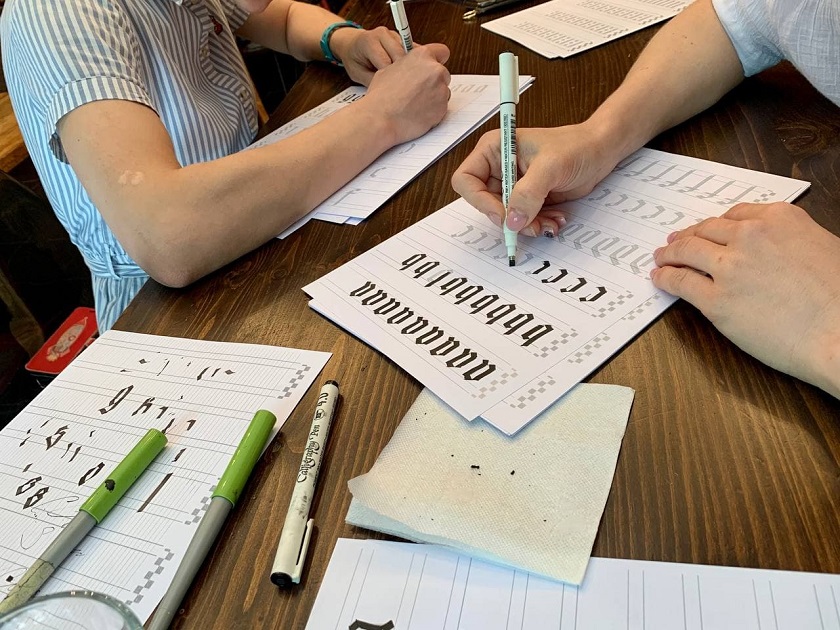 В субботу в кофейне собралось не так уж много человек, но каждый из них стремился научиться писать каллиграфию. Всем участникам мастер-класса полагалась перьевая ручка, рабочая тетрадь и бесплатный кофе.