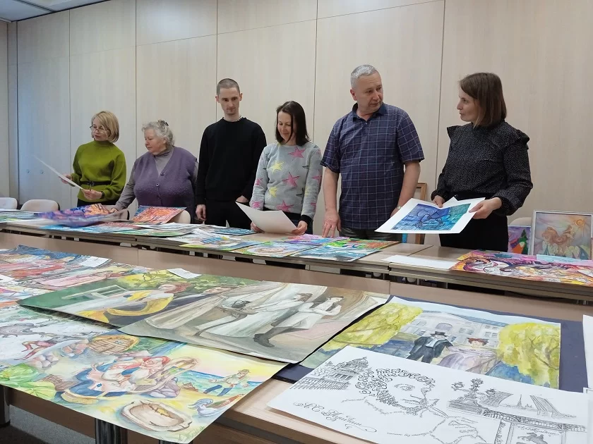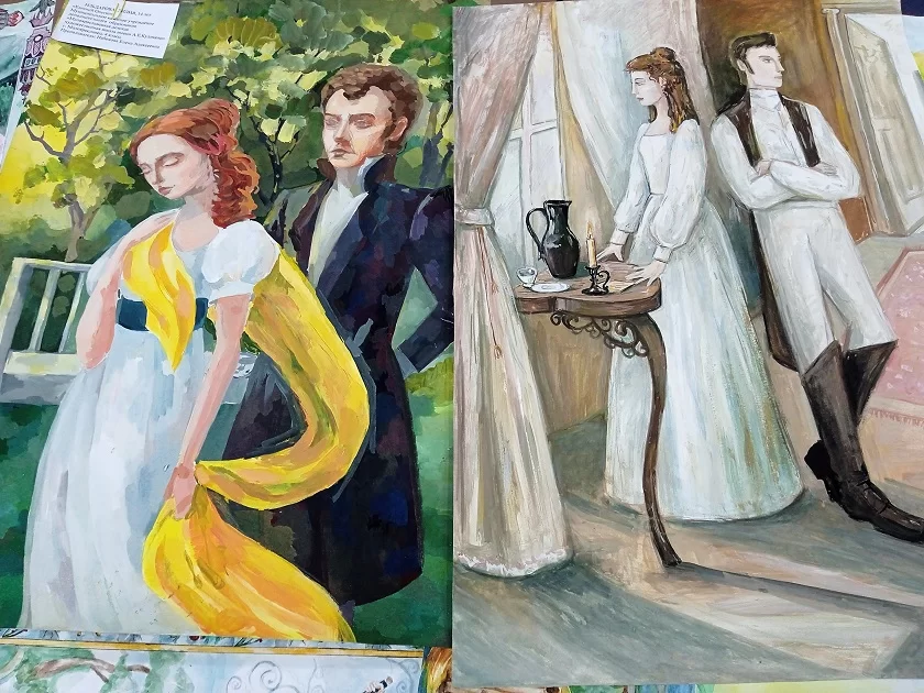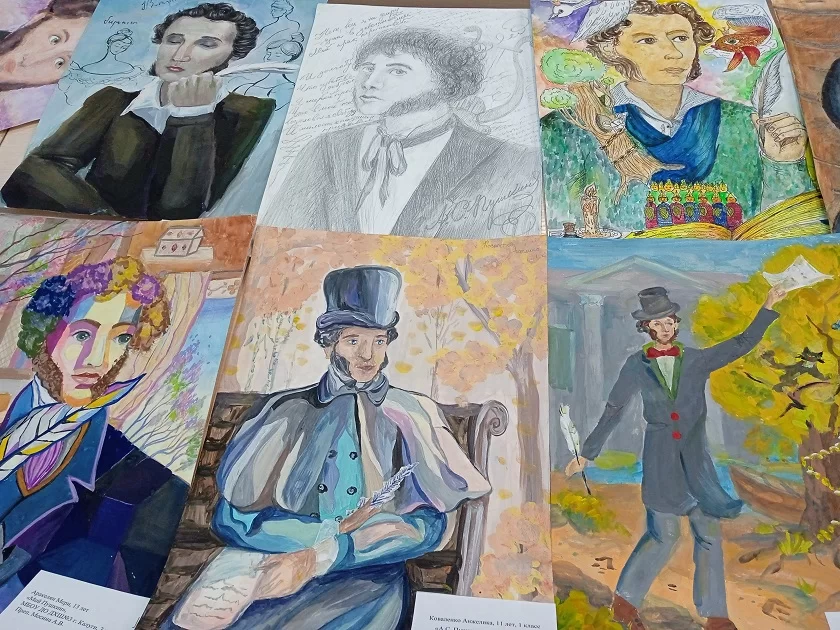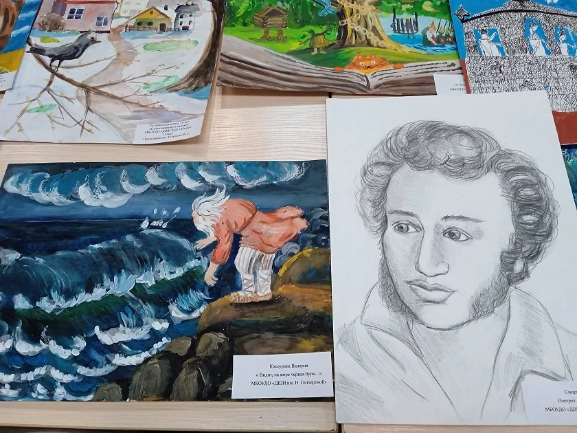 На рисунках детей: портреты Пушкина и персонажи его произведений – Кот ученый, Петушок, золотые рыбки. Кто-то из участников героями для себя выбрал Барышню-крестьянку и Дубровского. Кто-то нарисовал поэта вместе его музой Натали в парке усадьбы «Полотняный Завод».