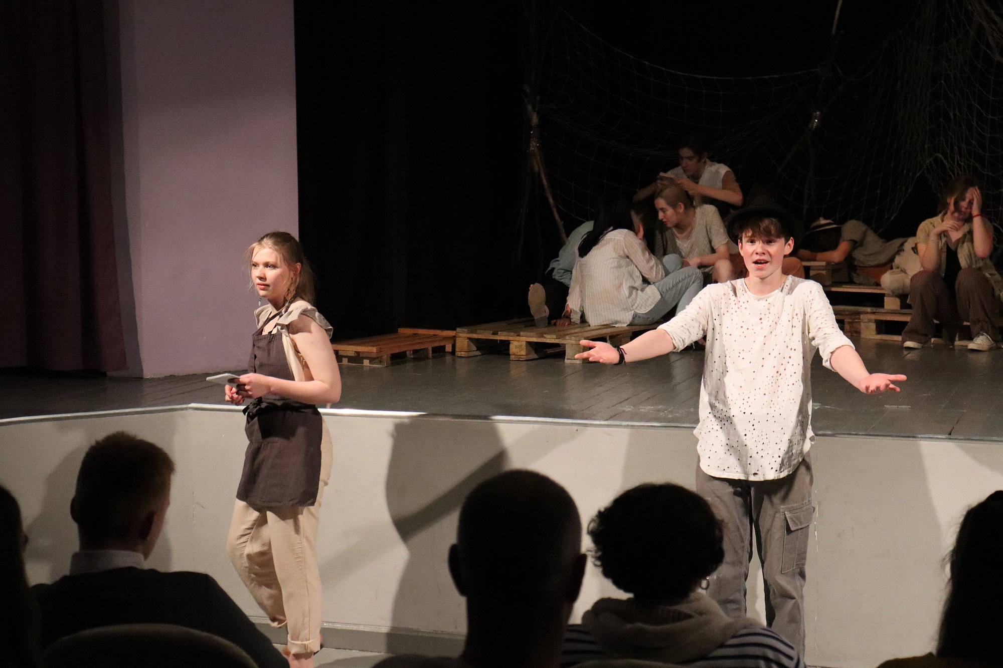 С первых минут действия актёры захватили своей энергетикой всё пространство, создали атмосферу шумной компании. Зрители попали в гущу событий, связанных с жизнью беспризорников – «капитанов песка». На протяжении всего спектакля героям приходится выживать и сталкиваться с трудностями морального выбора.