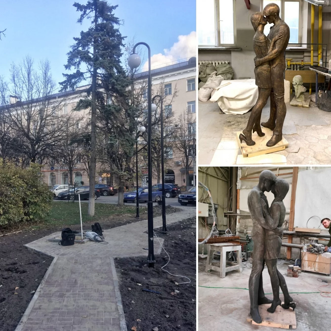 «Очень тихий, «не кричащий», романтический образ молодости и любви. Небольшой, но актуальный вклад в нашу культуру, которую мы защищаем сегодня с оружием в руках. Уже установлены и подключены фонари, уложено мощение, подготовлен фундамент с закладными деталями под скульптуру. Сама композиция отлита и готова к отправке из литейного цеха в Калугу»,