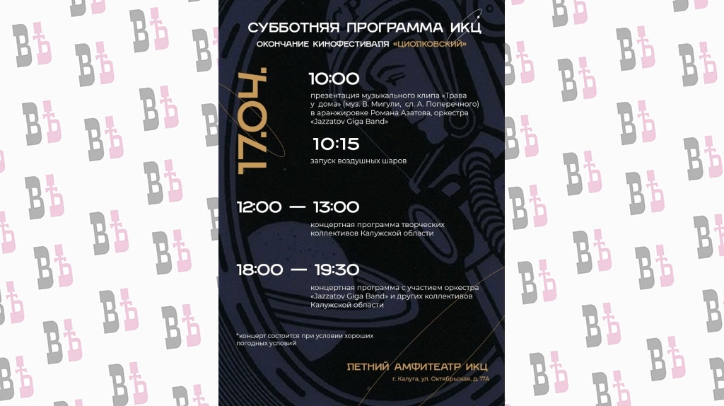 Концертная программа творческих коллективов Калужской области начнется в 12:00, а в 18:00 на сцену выйдет оркестр Jazzatov Giga Band.