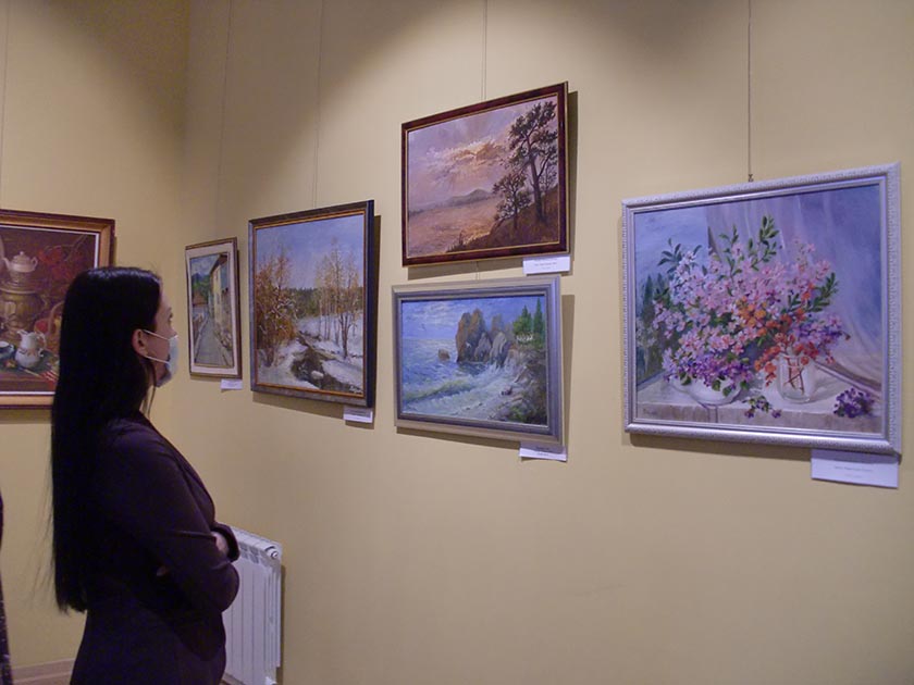 В экспозиции – пейзажи и натюрморты. Скромные. И все же в них есть роскошь. На одних полонах – это роскошь лавандовых полей Крыма, цветов среднерусской полосы, букетов сирени. На других – совершенство зимы. Изящной, красивой. Зимние виды Калужского края, его православные святыни очень выразительны. Щемяще трогательно представлена и уральская осень. Впечатления от путешествий по России ложатся на холст. Кажется, что в каждой картине запечатлено мгновение, хотя некоторые «шлифуются» доводятся до совершенства уже в мастерской.