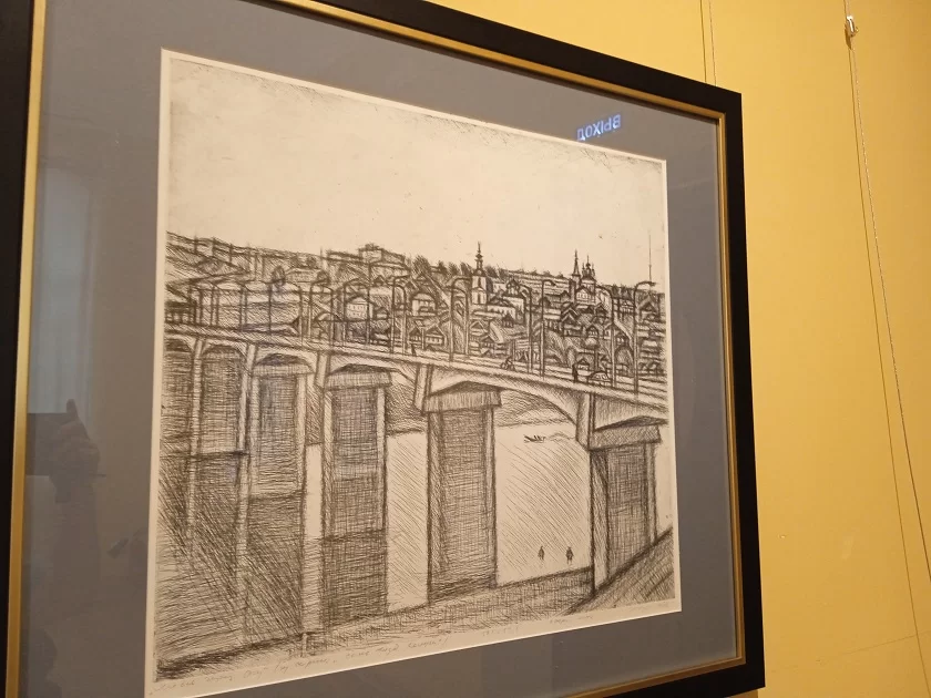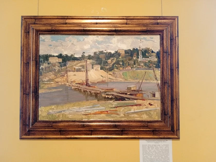 А в работах, большинство из которых графические, обилие строительных лесов, кранов и еще только начинающий свою звездную историю Музей космонавтики (он строился с 1963 по 1967 год), новый на тот момент стадион «Локомотив», магазин «Калуга», Дом быта, построенный в 1972 году, микрорайоны Черемушки и Правобережье (на правом берегу активная застройка началась в 1980-е годы), мост через Оку. И, конечно, люди, деловито возводившие современные здания.
