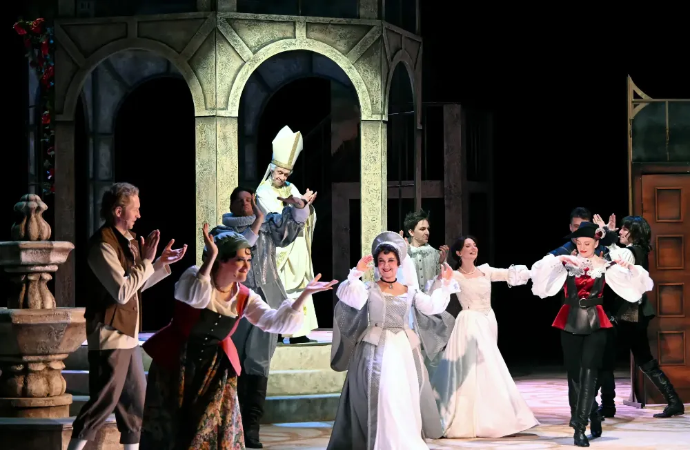 В этом легком искрометном спектакле московского режиссера, народного артиста России Николая Лазарева много музыки и пения, шуток и смеха, яркие костюмы тульского мастера Ирины Блохиной, стилизованные под старину подвижные декорации. Сцены боя поставил актер Калужской драмы Владимир Прудников - он сам отлично фехтует.