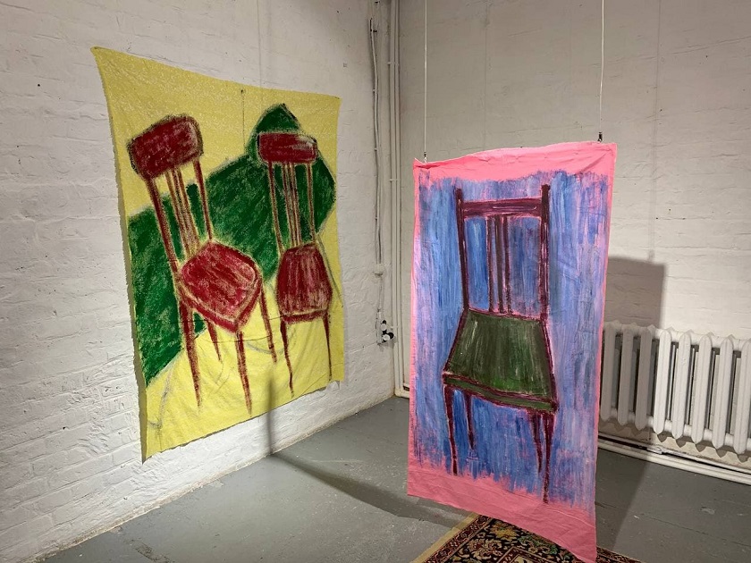 Среди объектов экспозиции розовый свитер, пестрый ковер, клетчатый шарф, зеленый вельветовый пиджак. Некоторые из них были созданы прямо в стенах калужской галереи.