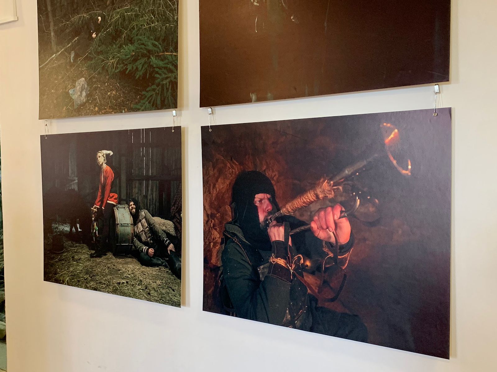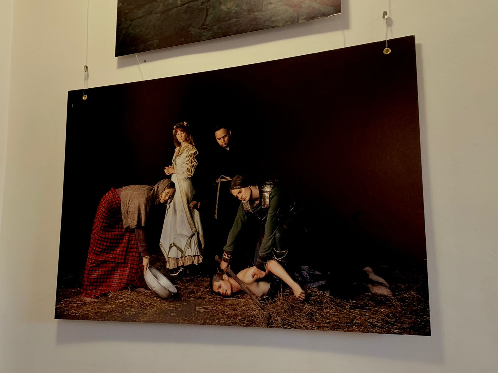 Выставка началась с пролога «Раненый ангел», который поставил сам Виталий. К зрителям вышли герои с фотографий. Рыцарь и монах несли ангела с перебинтованной головой на носилках – аллюзия на картину финского художника Хуго Симберга. Замыкал эту странную процессию скоморох с барабаном.