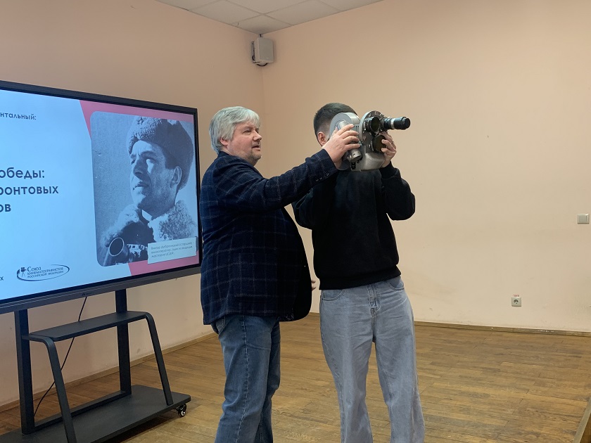 Встреча была посвящена фронтовой документалистике и судьбе кинооператоров Центральной студии документальных фильмов на войне. Андрей Истратов рассказал об истории отечественного документального кино, а также поделился профессиональными секретами со студентами-журналистами, в том числе рассказал, как искать образ для своего кино.