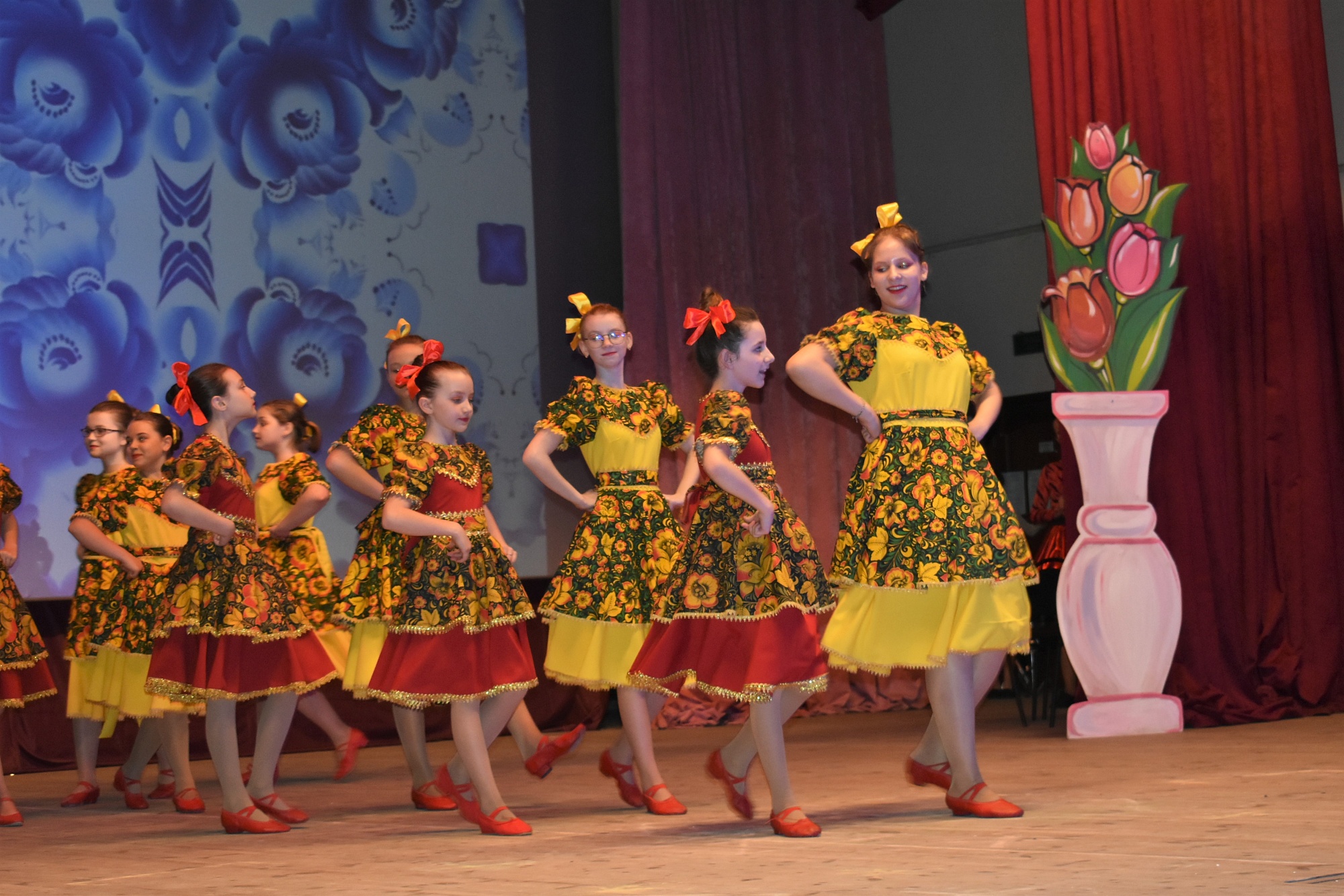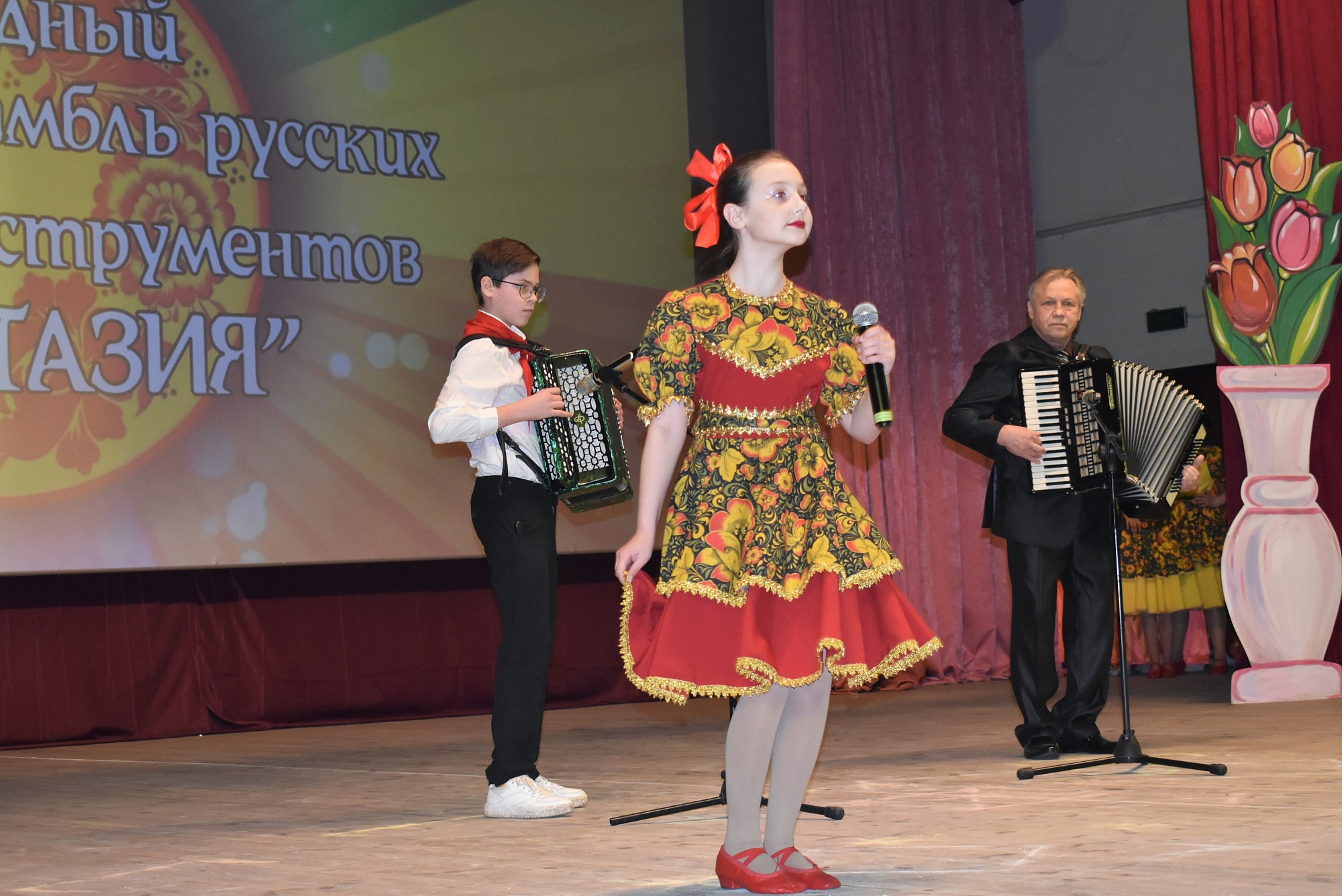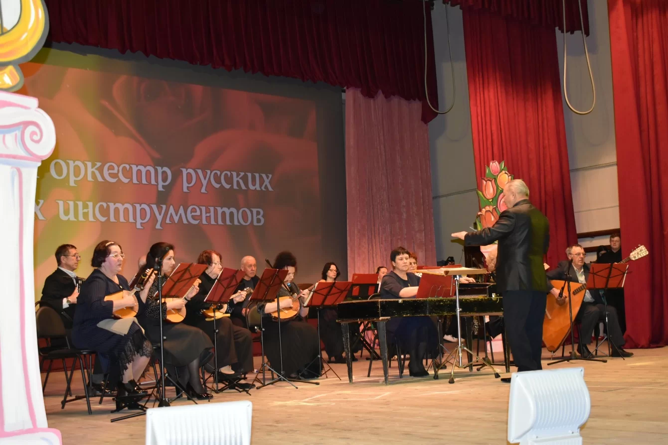 Концерт открыл оркестр русских народных инструментов, в котором ведущие партии исполнили педагоги школы. Оркестр под началом художественного руководителя и дирижёра, заслуженного работника культуры РФ Владимира Мартынова сыграл несколько произведений, в том числе «Вальс» композитора Евгения Доги и «Гусарский марш» композитора Андрея Петрова.