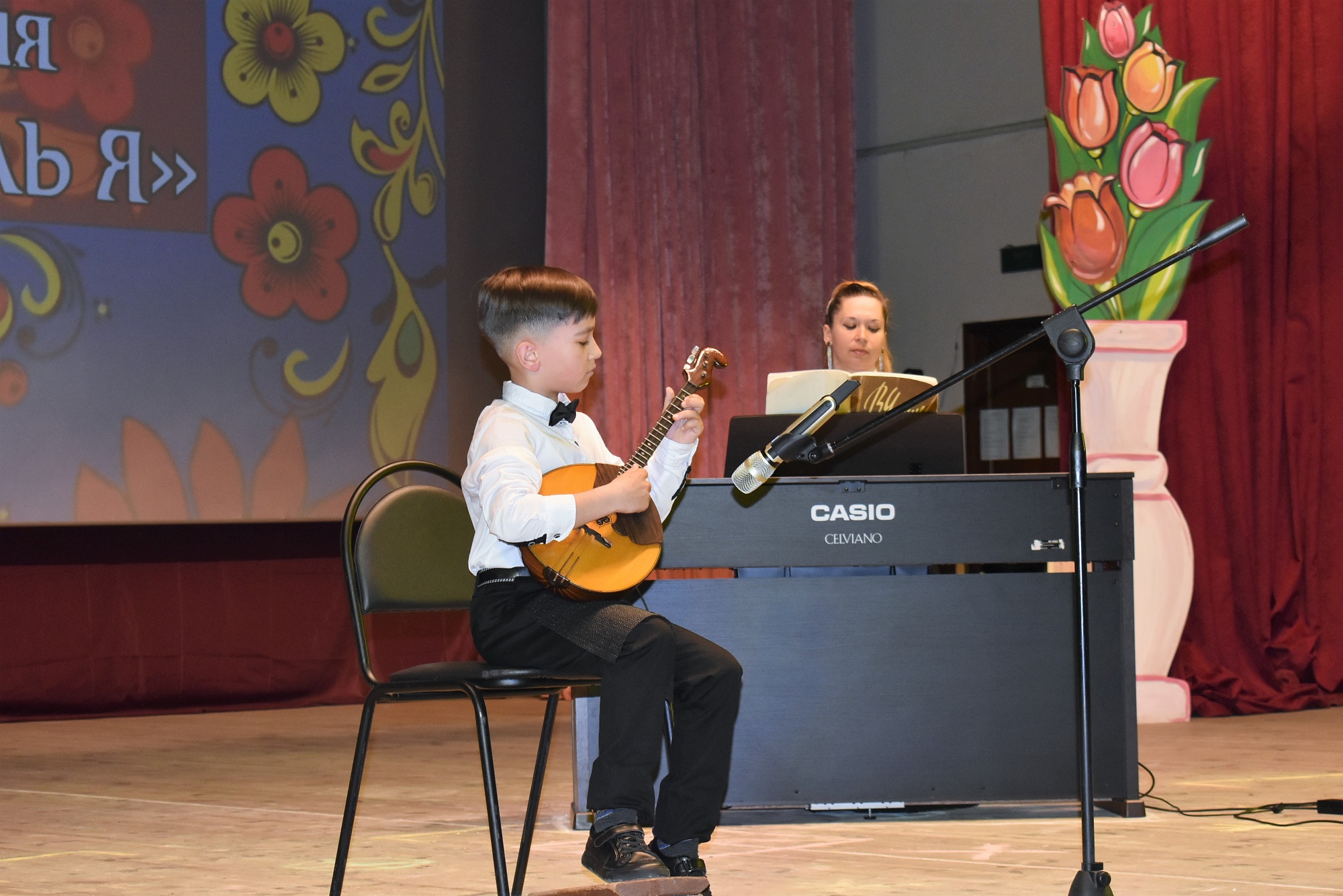 На сцене выступили учащиеся инструментального отделения. Даниил Трофимов (домра) сыграл народную песню «Пойду ль, выйду ль я», Анастасия Грешнова, Владислав Хатаженков и Екатерина Кузнецова (гитара), Полина Петракова (фортепиано) исполнили классические произведения.