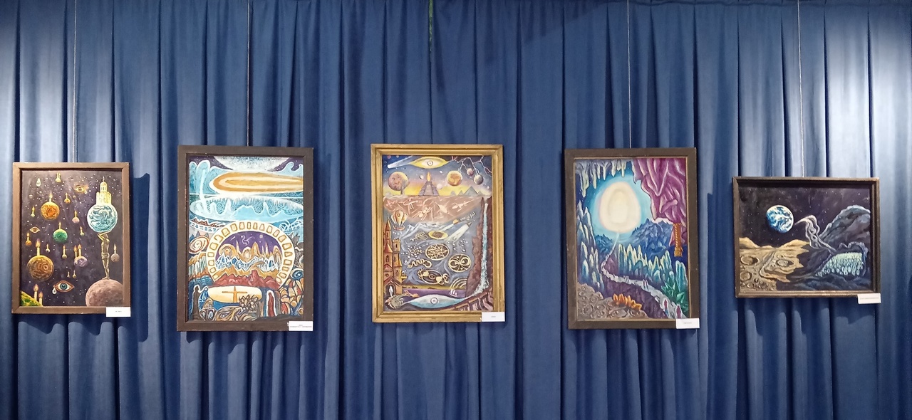 Экспозицию составили картины, которые художник подарил музею. Они посвящены теме космоса и человеческой души. Космос в представлении художника – это место, где находится суперразум, управляющий вселенной, куда обращен дух человека. Космической тематикой Александр увлекся в юности, во время учебы в Калужском пединституте. Тогда он познакомился с внуком Константина Эдуардовича Циолковского Алексеем Костиным. Это стало катализатором роста его интереса к космической философии.